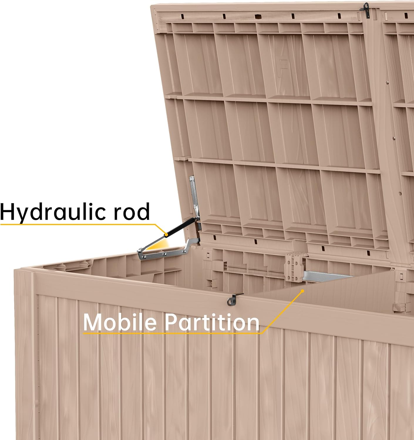 - Extra-Large Storage Capacity&Two Packages:With 180-gallon storage space (55.55 x 28.6 x 28.6 inches), it’s ideal for storing large outdoor items like garden tools, cushions, pool accessories, and more.The 180-gallon deck box has a different packaging method and is split into two packages: a large one and a small one. One package contains the deck box itself, and the other contains the necessary accessories for assembly. They may arrive at different times. If you receive only one of the packages, please wait patiently as the other package is still on its way.