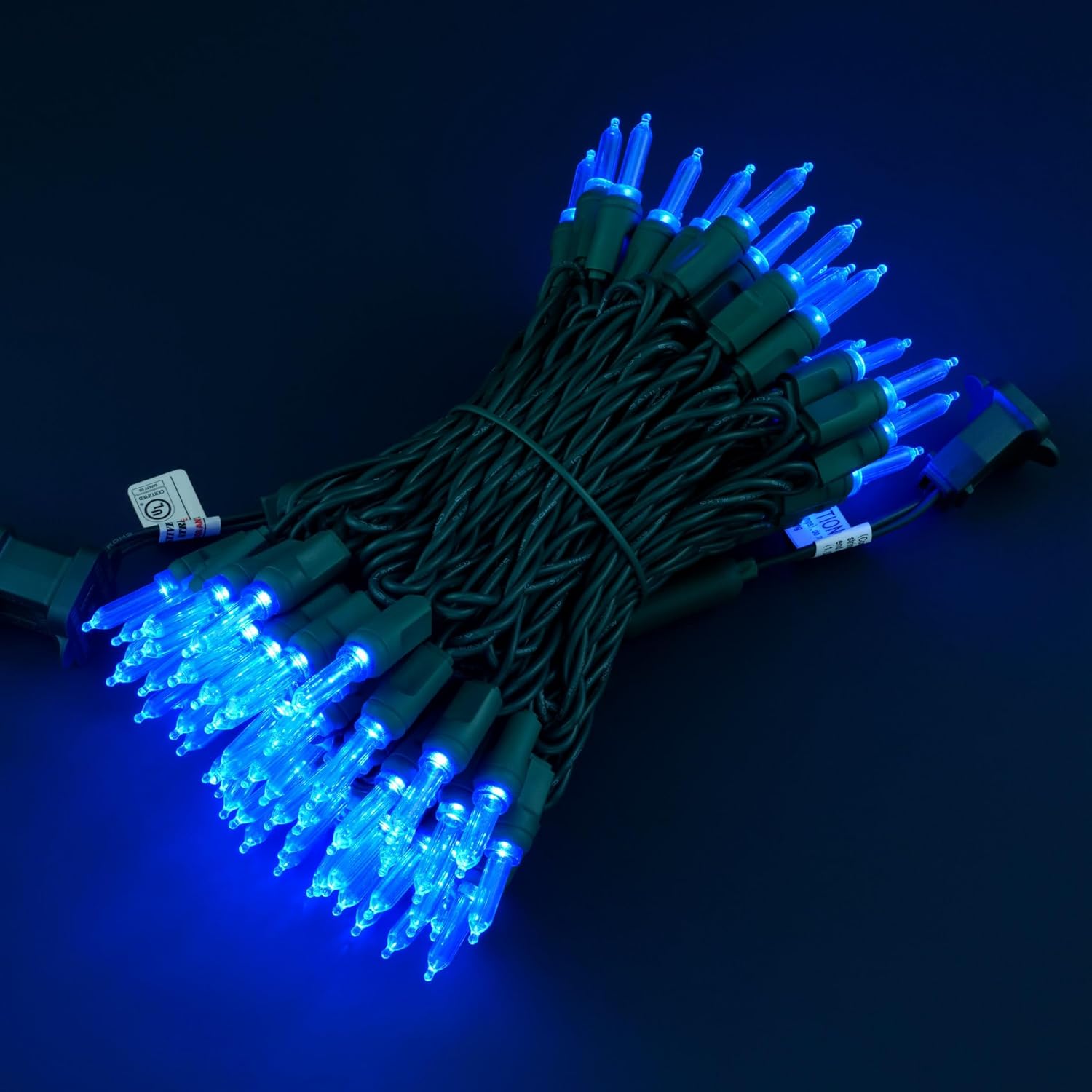 - SPECIFICATIONS ☀ Each pack contains 1 strands of one-piece string lights, total length 33 feet with 100 count blue mini lights. 22 AWG green cord, 4" lead, 4" spacing, 4" tail.
