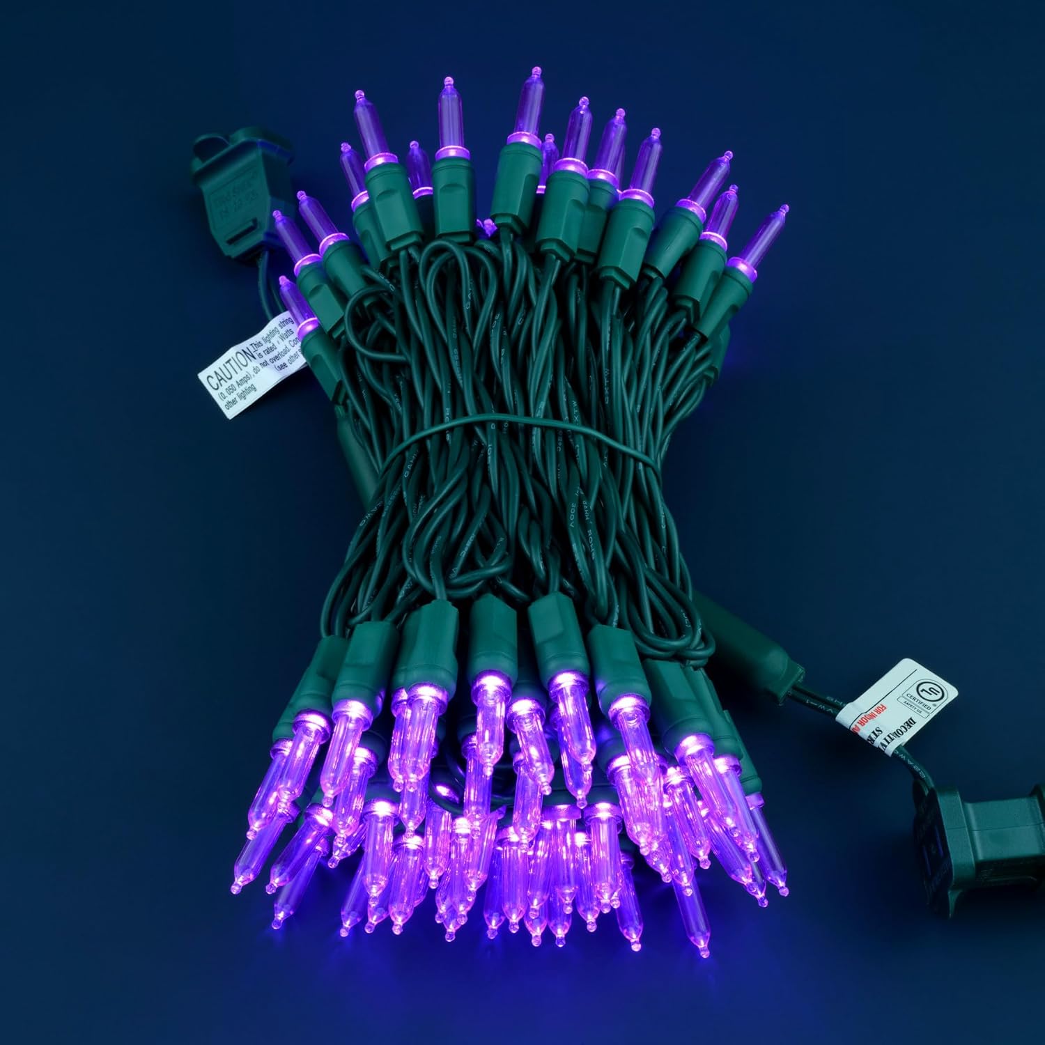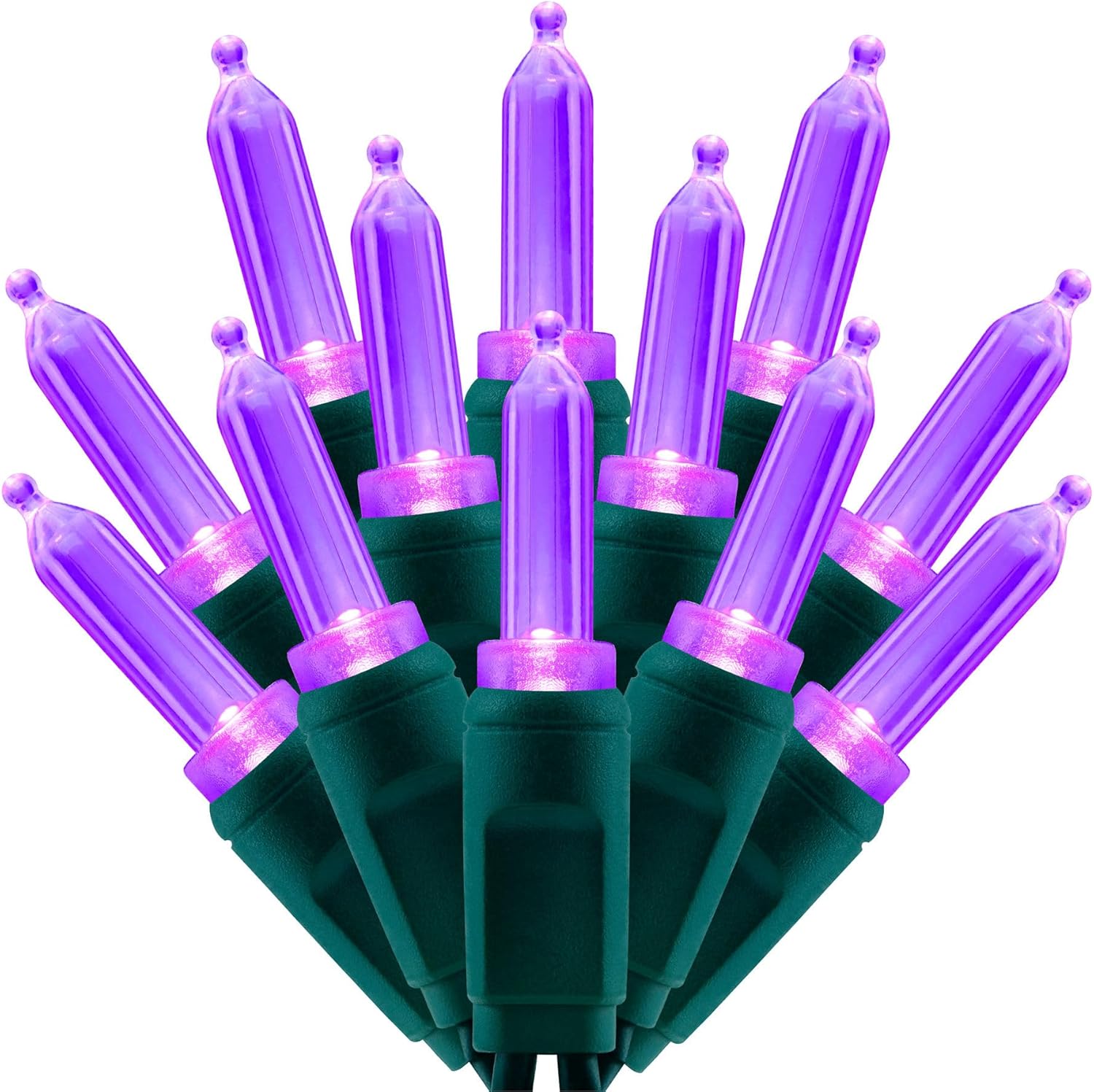 - SPECIFICATIONS ☀ Each pack contains 1 strands of one-piece string lights, total length 33 feet with 100 count purple mini lights. 22 AWG green cord, 4" lead, 4" spacing, 4" tail.