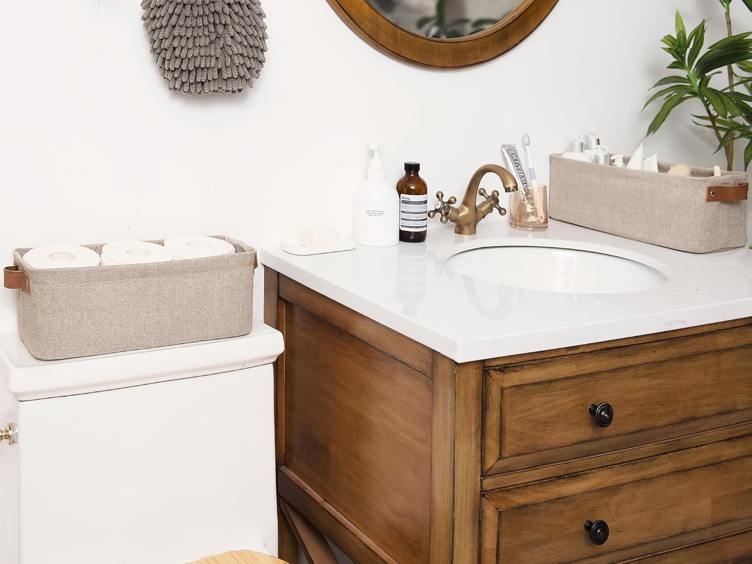StorageWorks Narrow Storage Bins, Small Basket for Closet and Shelves, Fabric Organizer with Handles, Toilet Paper Storage, Brown and Beige, 2-Pack