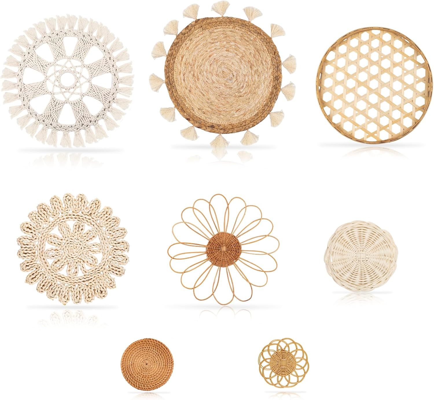 Boho Wall Basket Decor Set of 8 - Flat Woven Basket Wall Hanging Decor,Round Tassels White Macrame Tapestry Wall Decor Art,Handmade Rattan Wicker Seagrass Home Wall Baskets Decor(Boho Classic)