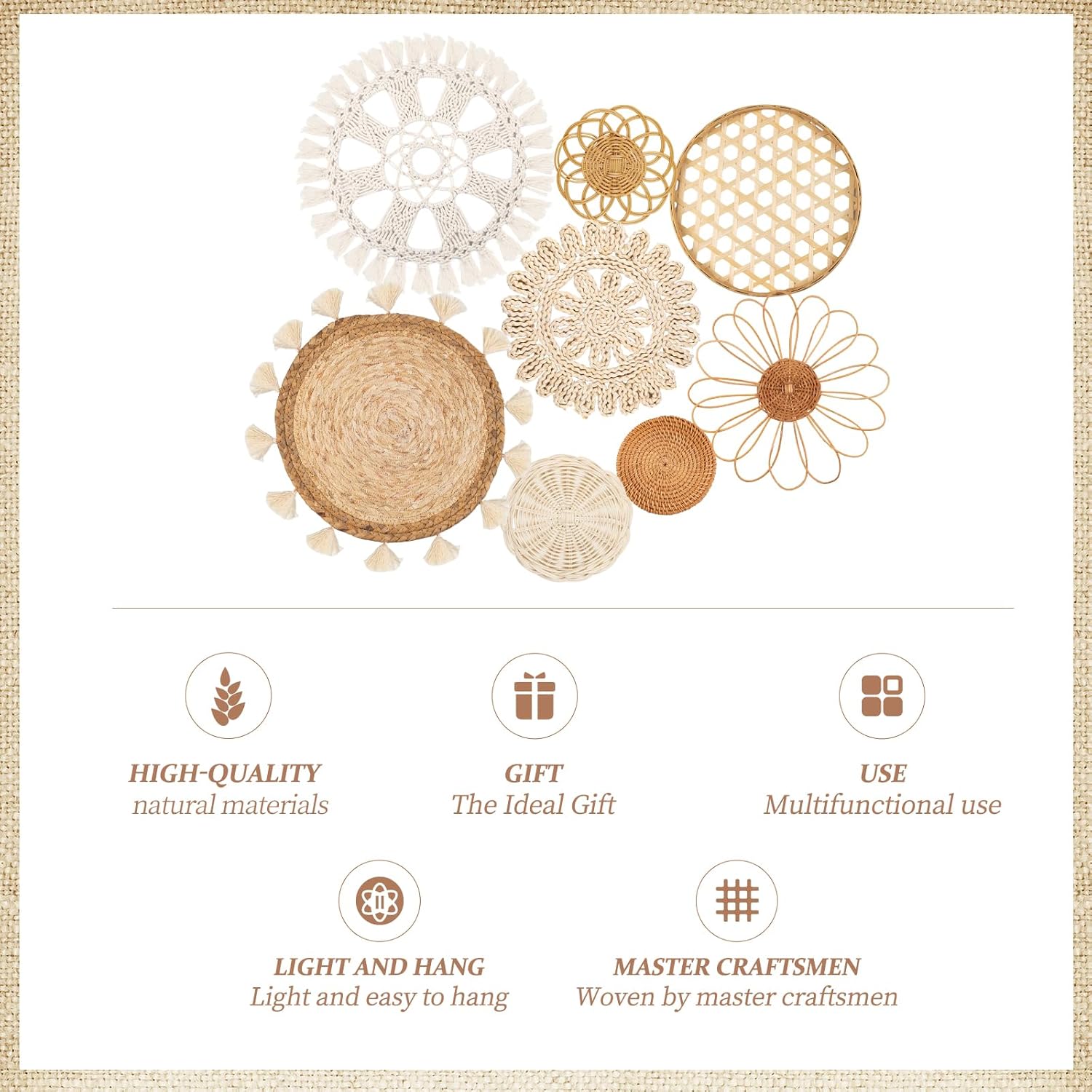 - 【Boho Atmosphere】: These wall decors feature a unique bohemian style, the flat round woven design, combined with tassels and elegant macrame details, adds a distinctive touch to any room perfect for enhancing the atmosphere of your gallery walls, fireplace, wedding backdrops, and bohemian themed parties.