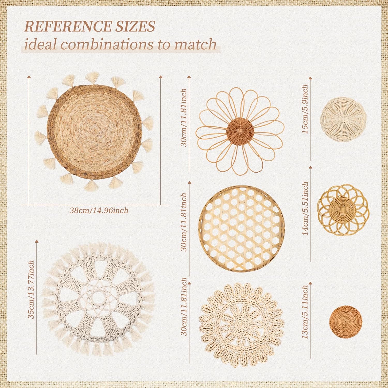 - 【Perfect Size Combination】: Featuring sizes ranging from approximately 38cm/14.96in to 13cm/5.11in, these baskets are perfect for hanging on walls, adding an artistic touch to your room, bedroom, or living room.