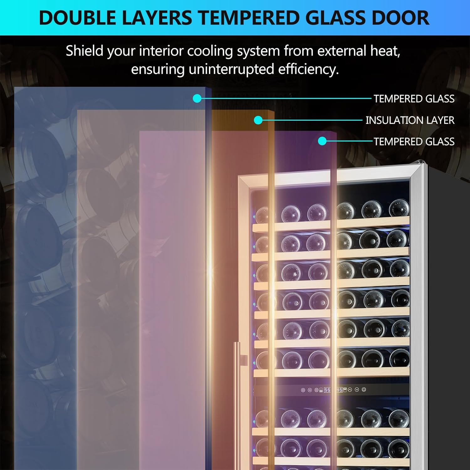 - ăDouble-Layer Glass Door and Safety Lock DesignăThe wine cabinet features a double-layer tempered glass door, presenting a visually appealing wine display. This design effectively insulates against external temperature fluctuations, ensuring wines remain in optimal storage conditions. The safety lock adds an extra layer of security for your valuable collection.