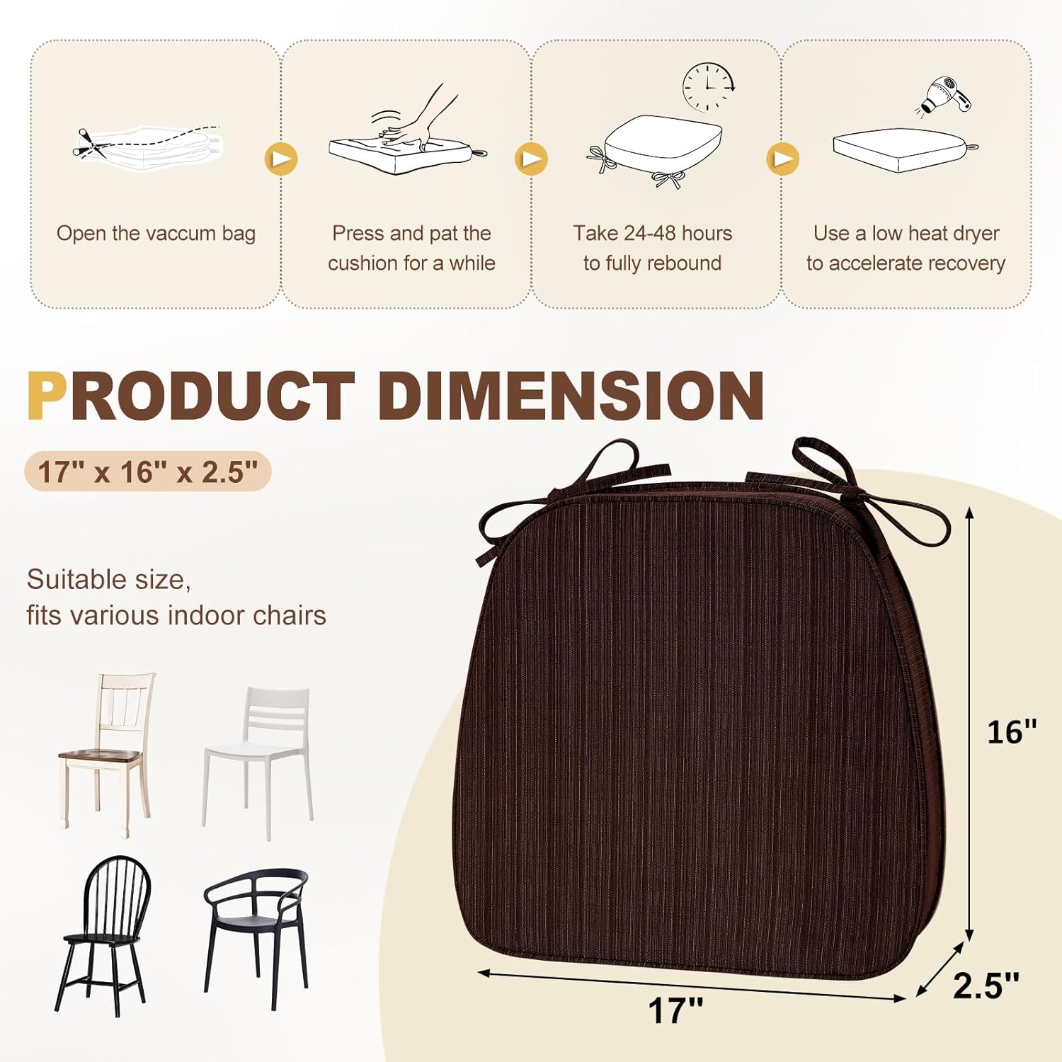 downluxe Chair Cushions for Dining Chairs, Waterproof Kitchen Chair Pads, Non-Slip Dining Seat Cushion with Ties, 17" x 16" x 2.5", Brown, 4 Pack
