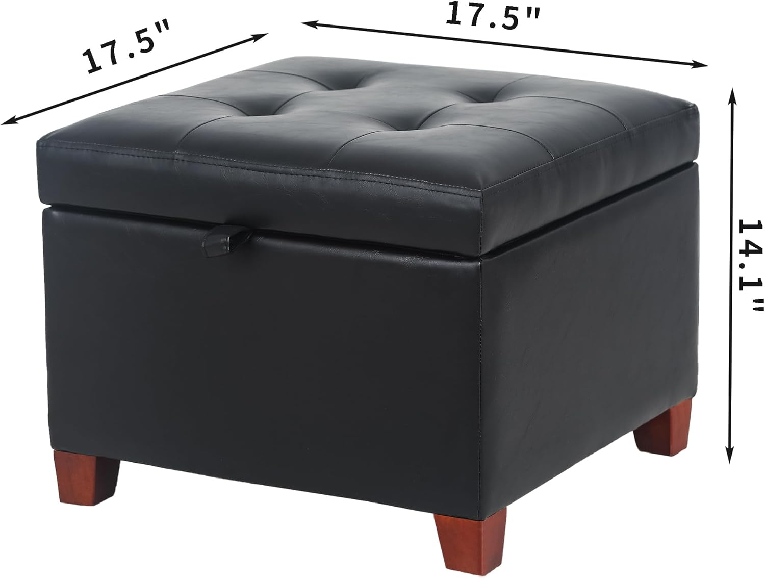 Adeco Faux Leather Storage Ottoman with Hinged Lid, 14 Inch High Black Square Cube Foot Stool with Storage, Upholstered Vanity Stool with Solid Wood Legs for Living Room, Bedroom, Dorm