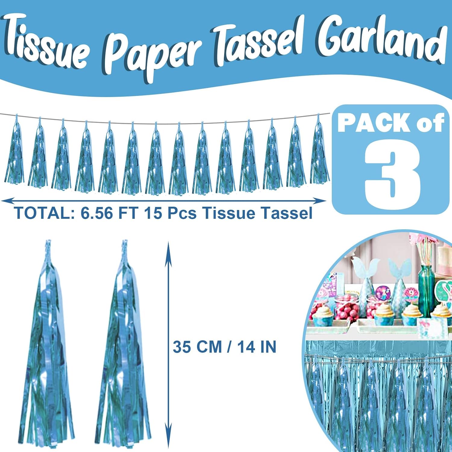 - 【Light Blue Party Supplies Set】: The total length of the light blue birthday tassels banner is 29.5 feet 45tassels, divided into 3 strips, each 9.8 feet long. Each banner contains 15 tassels, and each tassel measures 14 inches, for birthday decorations many occasions, and so on