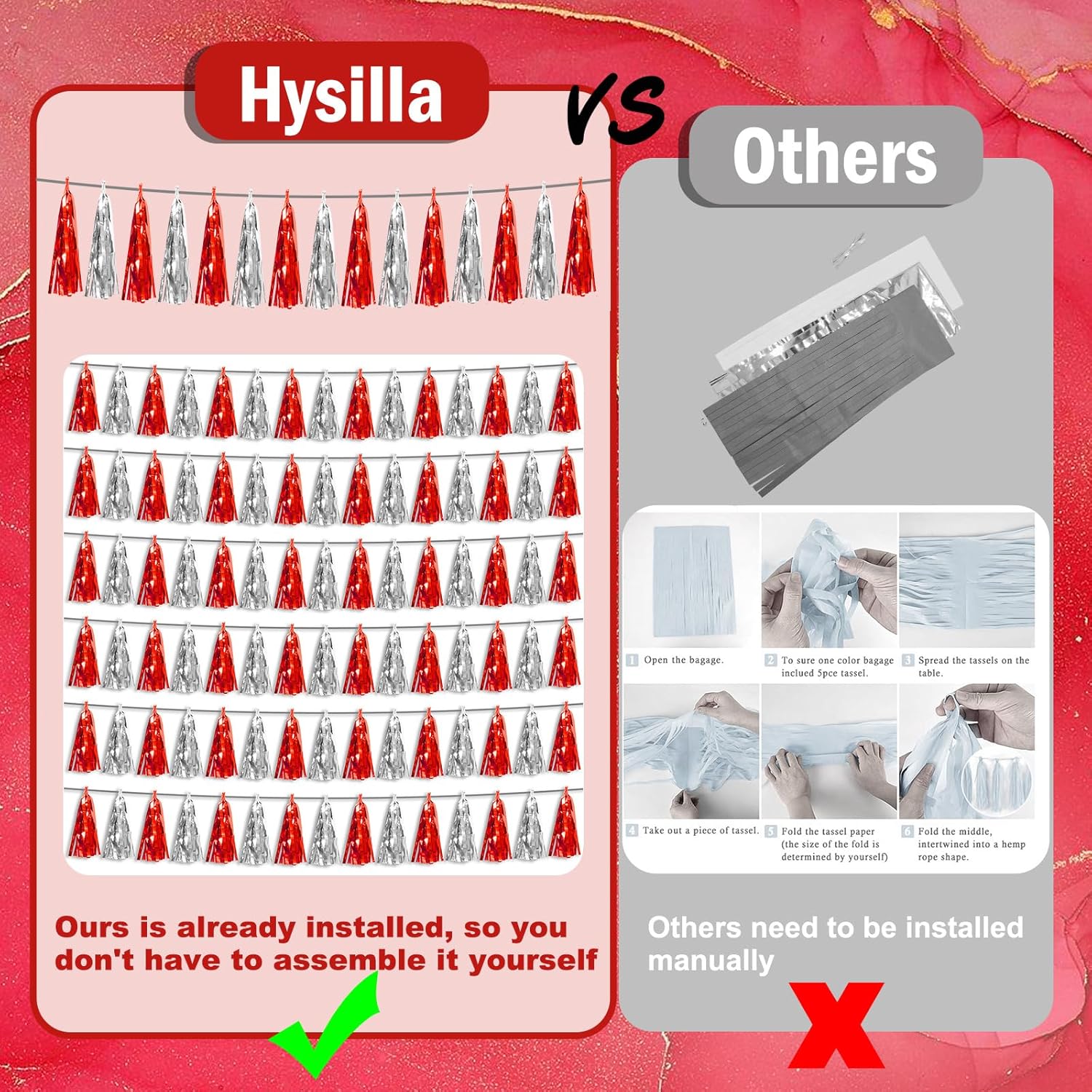 - 【Red Silver Party Supplies Set】: The total length of the Red Silver birthday tassels banner is 29.5 feet 45tassels, divided into 3 strips, each 9.8 feet long. Each banner contains 15 tassels, and each tassel measures 14 inches, for birthday decorations many occasions, and so on