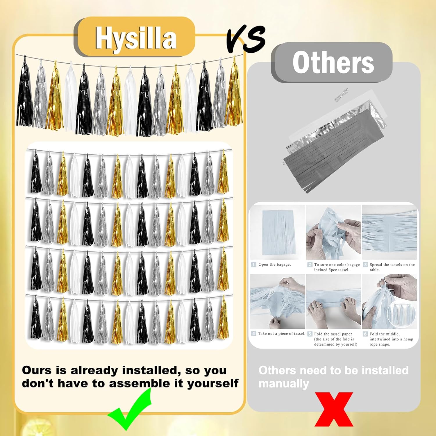 - 【Black Silver Gold White Party Supplies Set】: The total length of the Black Silver Gold White birthday tassels banner is 29.5 feet 45tassels, divided into 3 strips, each 9.8 feet long. Each banner contains 15 tassels, and each tassel measures 14 inches, for birthday decorations many occasions, and so on