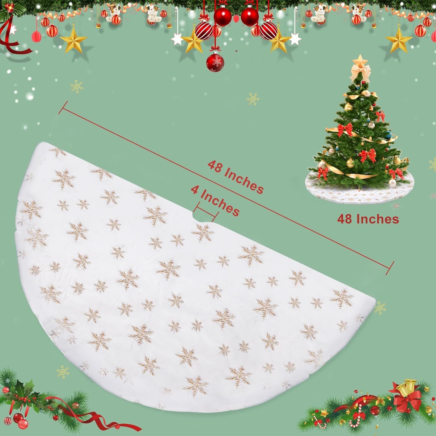 Christmas Tree Skirt, 48 Inch White Luxury Faux Fur & Gold Sequin Snowflakes, 4ft Xmas Tree Skirt for Holiday Tree Ornaments Christmas Party Home Decorations