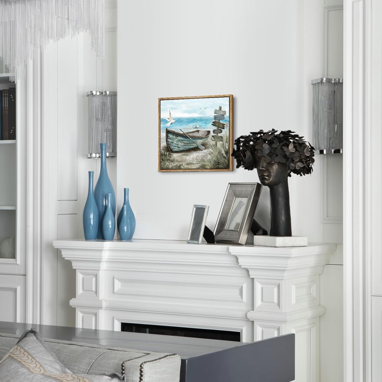 Framed Wall Art Beach Décor Ocean Canvas Picture Coastal Artwork Sea Bird Boat Blue Tan Small Rustic Beachy Canvas Print for Bathroom Bedroom Living Room