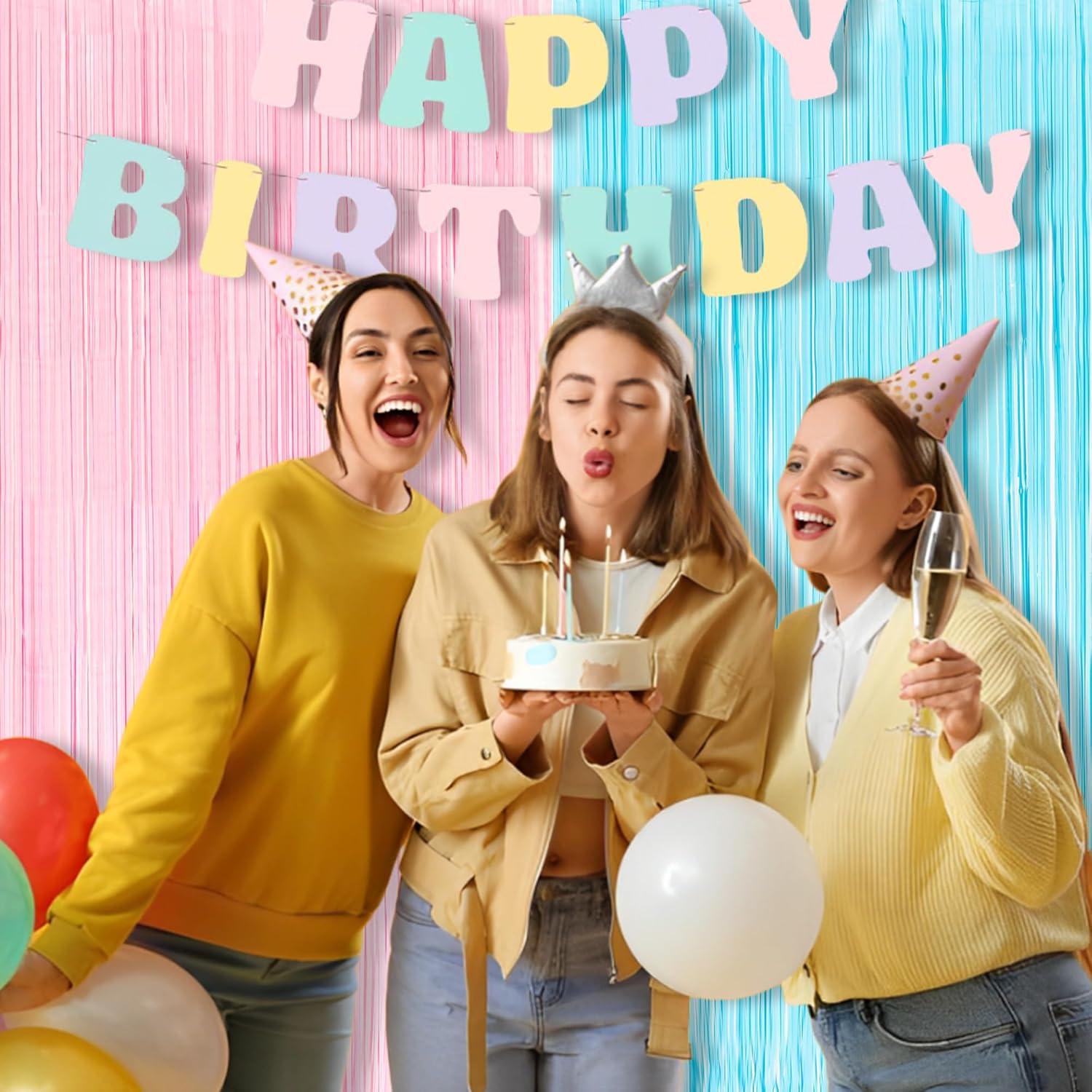 BRAVESHINE Tinsel Photo Backdrop Curtains - 2 Pack 3.2x8.2ft Pastel Pink Blue Foil Fringe Streamer Curtain for Boy or Girl Birthdays Sweet Donuts Easter Party Decorations