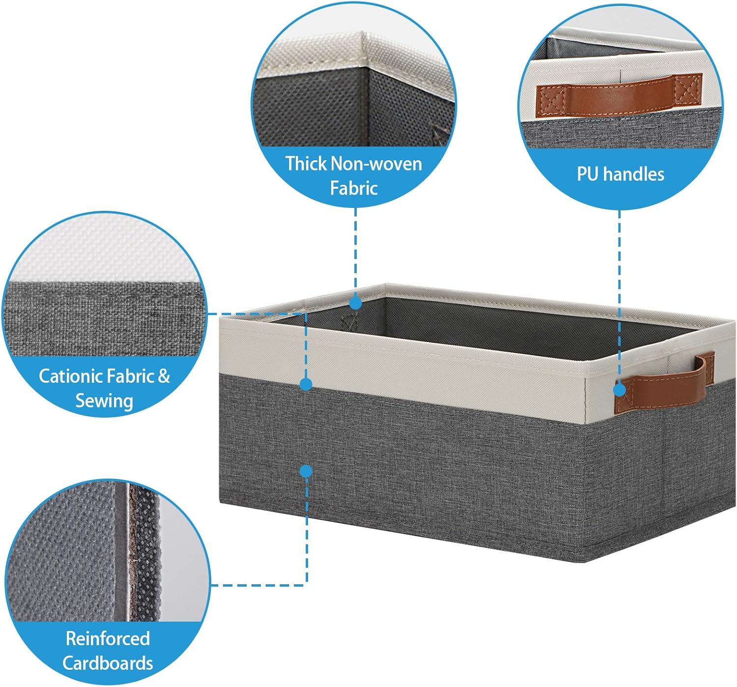 - 👍【QUALITY MATERIAL】Storage baskets for shelves are made of high-quality cationic fabric and polyester cotton fabric, and the inner layer is made of non-woven fabric, which is odorless, long-lasting and strong. Classic faux leather handles that adds a comfortable touch and provides a strong and comfort grip to pull and move. Fabric storage bin is easy to clean, just wipe with a damp sponge or cloth.