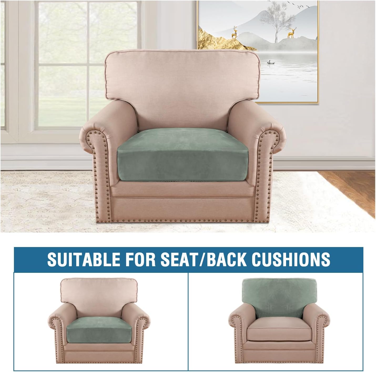 H.VERSAILTEX Velvet Stretch Couch Cushion Cover Plush Cushion Slipcover for Chair Cushion Furniture Protector Seat Cushion Sofa Cover (1 Piece Armchair Cushion Covers, Sea Grass)