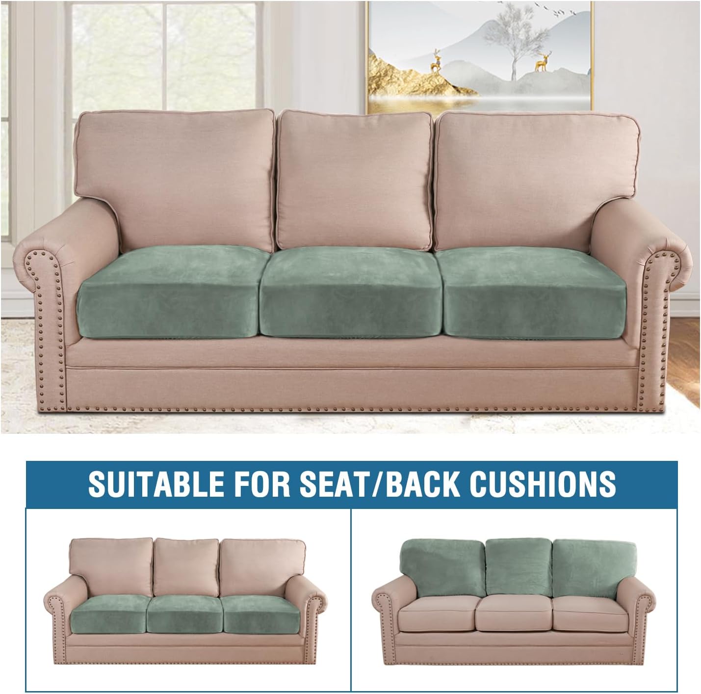 H.VERSAILTEX Velvet Stretch Couch Cushion Cover Plush Cushion Slipcover for Chair Loveseat Sofa Cushion Furniture Protector Seat Cushion Sofa Cover (3 Piece XL Sofa Cushion Covers, Sea Grass)