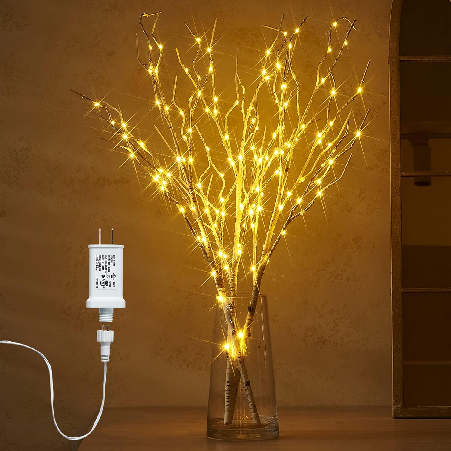 - đă150 LED lightsă32in tall with three separate branches,totally 150 warm white lights arranged on,is best for room decoration.Assembled with 3 plastic stakes helps to fit with a taller vase and make it easy to use in garden.