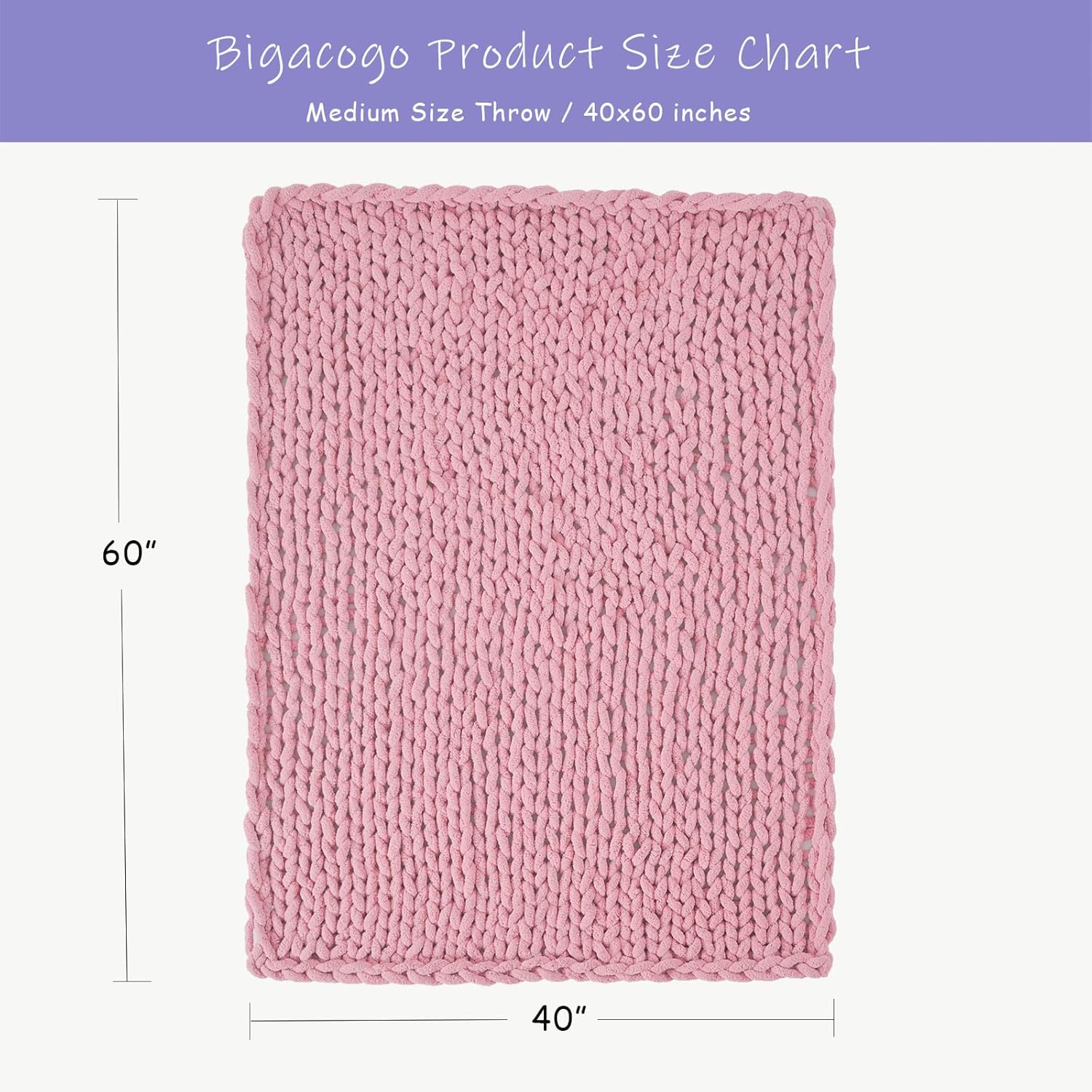 Bigacogo Chunky Knit Throw Blanket for Couch, 40x60 inches, 100% Hand Knitted with Thick Jumbo Chenille Yarn, Cozy Soft Large Rope Knot Cable Crochet Blankets for Sofa Bed Living Room, Blush Pink