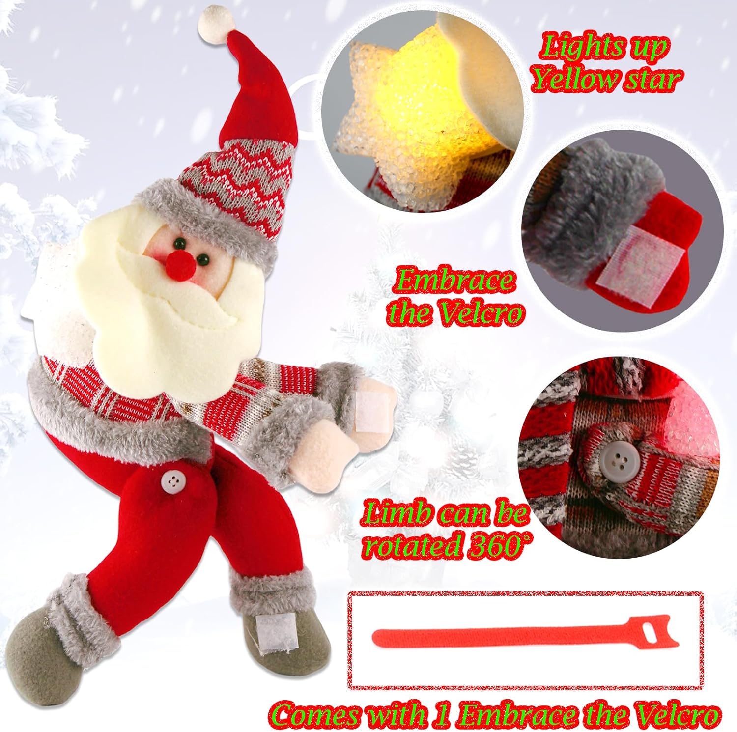 Christmas Plush Santa Claus Tree Topper with Light-up Yellow Star,Xmas Treetop Ornament-Also Be Used As Home Curtain Tie and Hugger Wine Bottle Party Decorations