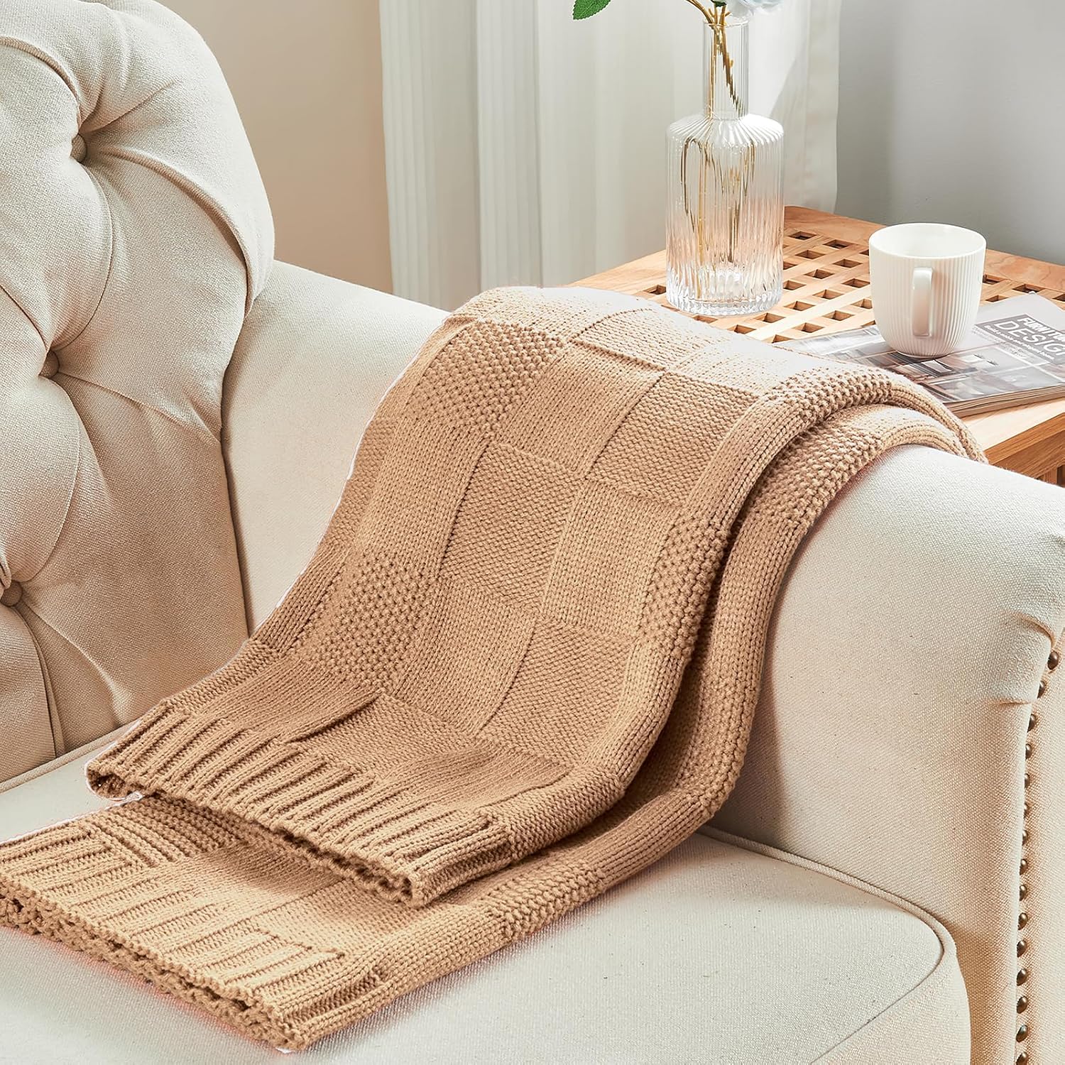CozeCube Check Knit Throw Blanket, Beige Checkered Throw for Couch, Decorative Christmas Soft Cozy Warm Knitted Blanket for Bed Sofa Living Room, 50"X60"