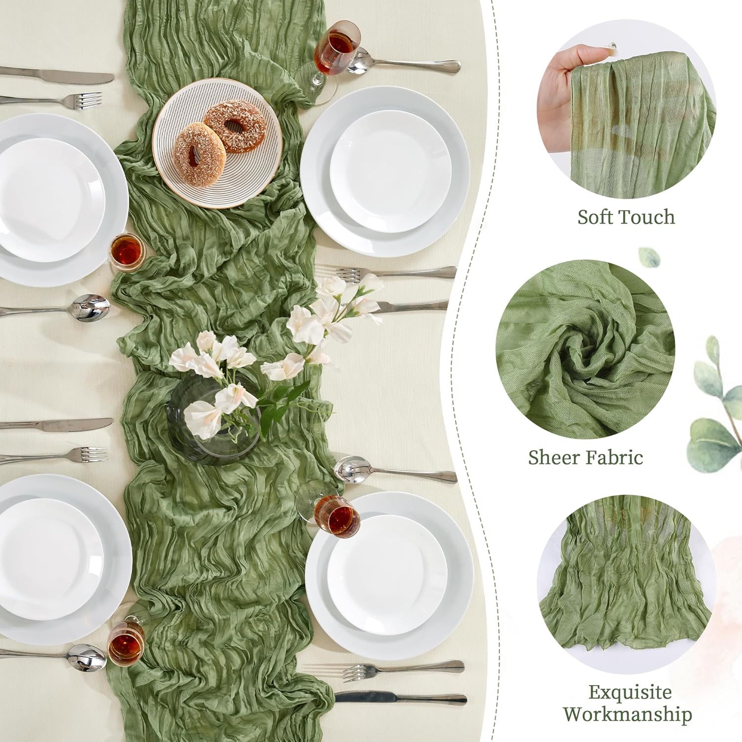 12 Pack Sage Green Cheesecloth Table Runner 10FT Long Boho Gauze Table Runner Rustic Sheer Runner for Wedding Bridal Baby Shower Birthday Party Table Decor Thanksgiving Christmas Decorations