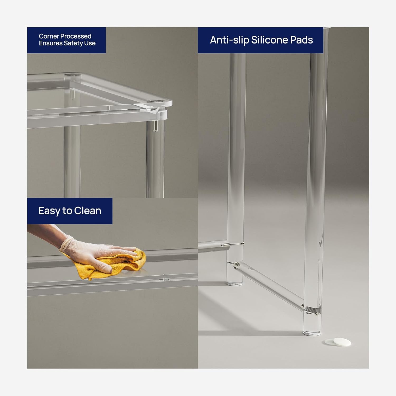- Modern Simple Design: This acrylic desk stands out with its modern and sophisticated design. Its transparent acrylic material gives it a unique sense of fashion, effortlessly blending with various decor styles. The corner processed ensures safety use.