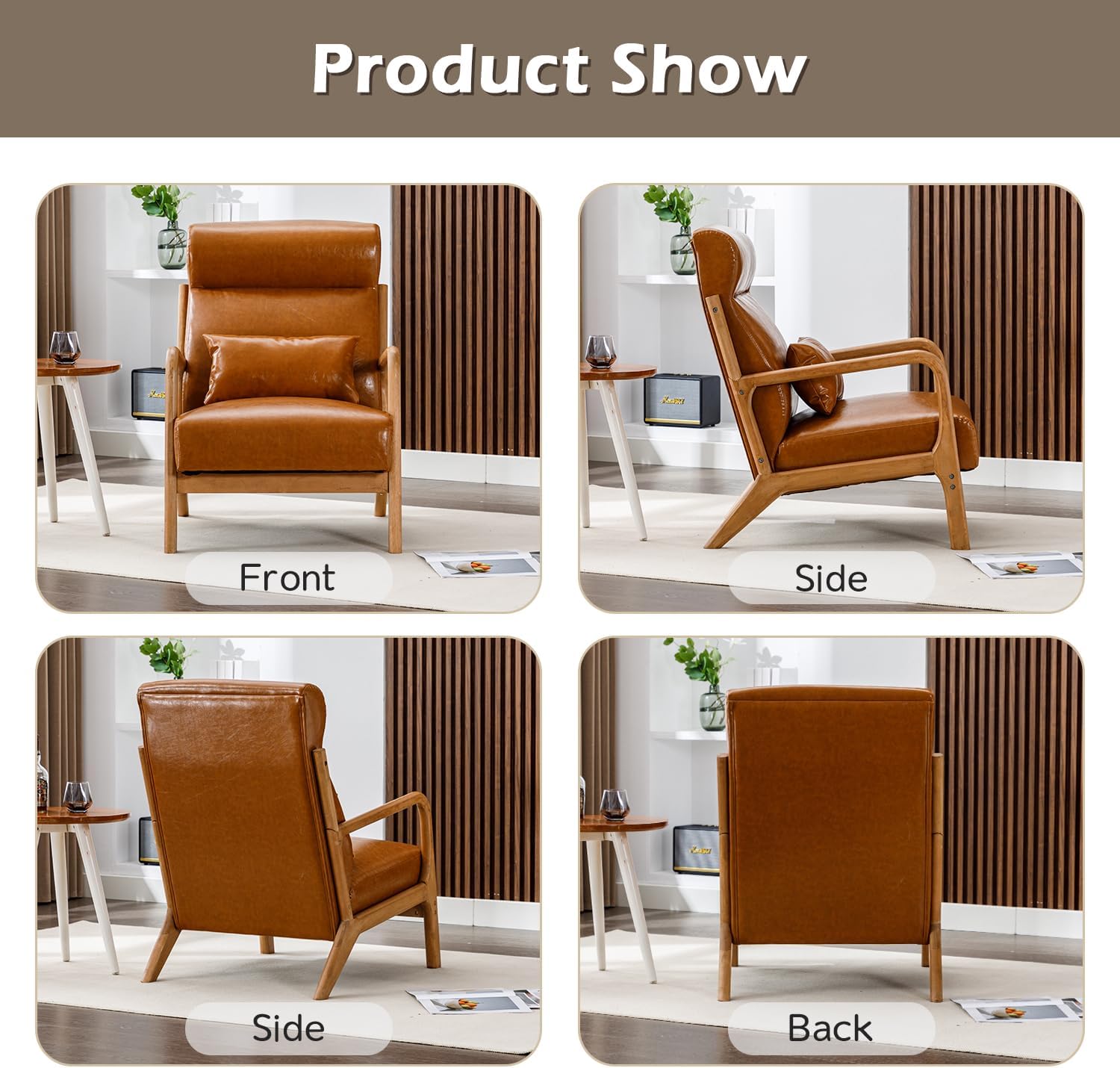 INZOY Mid Century Modern Accent Chair with High Back, PU Leather Reading Armchair with Waist Cushion, Upholstered Wood Frame Living Room Chairs for Bedroom Sunroom, Camel