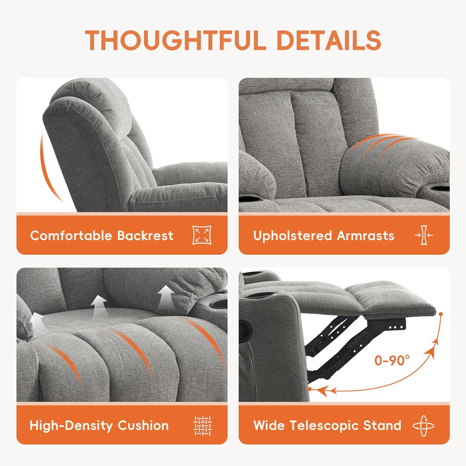 - WONDERFUL EXPERIENCE: Relax in this wonderful chair with reclining, rocking, massage, heated and swiveling features.360 degree swivel and 150 degree recline features. The stunning armchair with drink holders has been developed to the highest standards, providing strength, durability and supreme comfort.