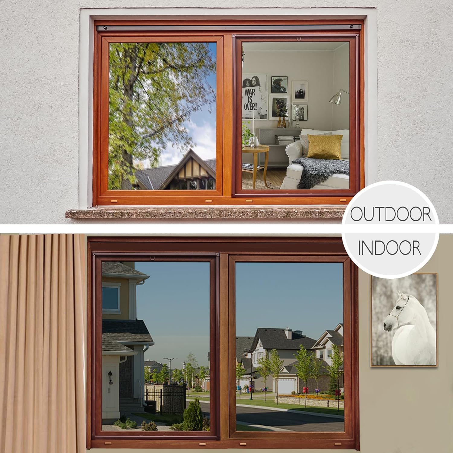 - SUPERIOR DAYTIME PRIVACY PROTECTION – Applying our window privacy film see out not in lets you see out and does not let prying eyes see in during daytime while letting natural lights in, and from the outside, the glass shows a mirror like reflective surface. NOTICE: When the inside light is stronger than the outside light at night, the house window tint CANNOT provide privacy, and the mirror reflective effect will disappear. Do remember to draw the curtains during the night.