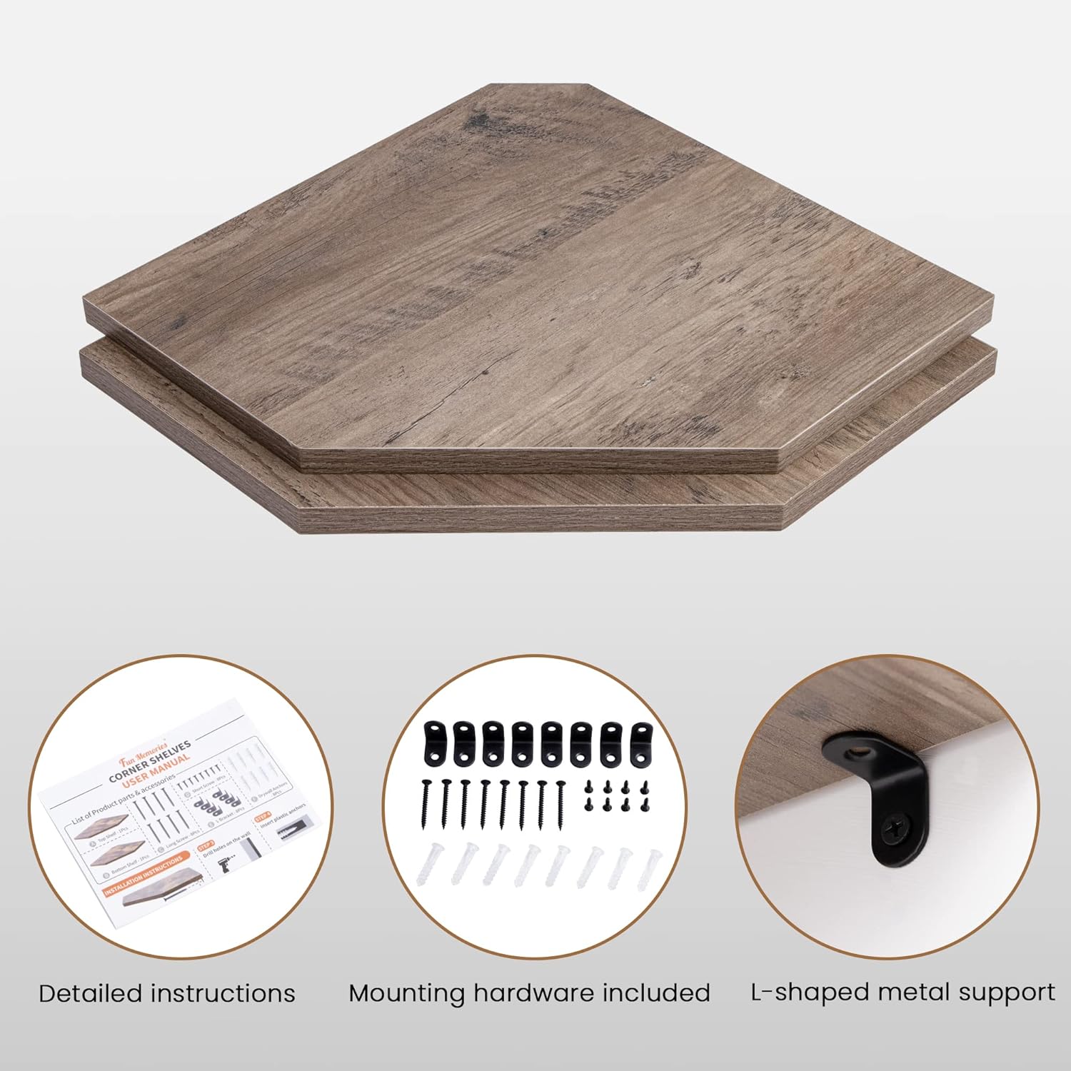 - ăEasy to MountăThe package comes with user-friendly instructions and all the necessary mounting hardware. Just place the corner wall shelf level in your desired location and secure it in place using the hidden bracket connectors provided, followed by screws