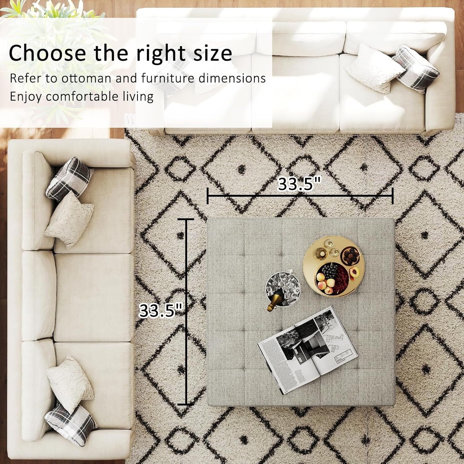 Large Square Ottoman Coffee Table, Linen Solid Upholstered Footrest Ottoman with Solid Wood Shelf Storage Tufted Coffee Table for Bedroom Living Room, Linen