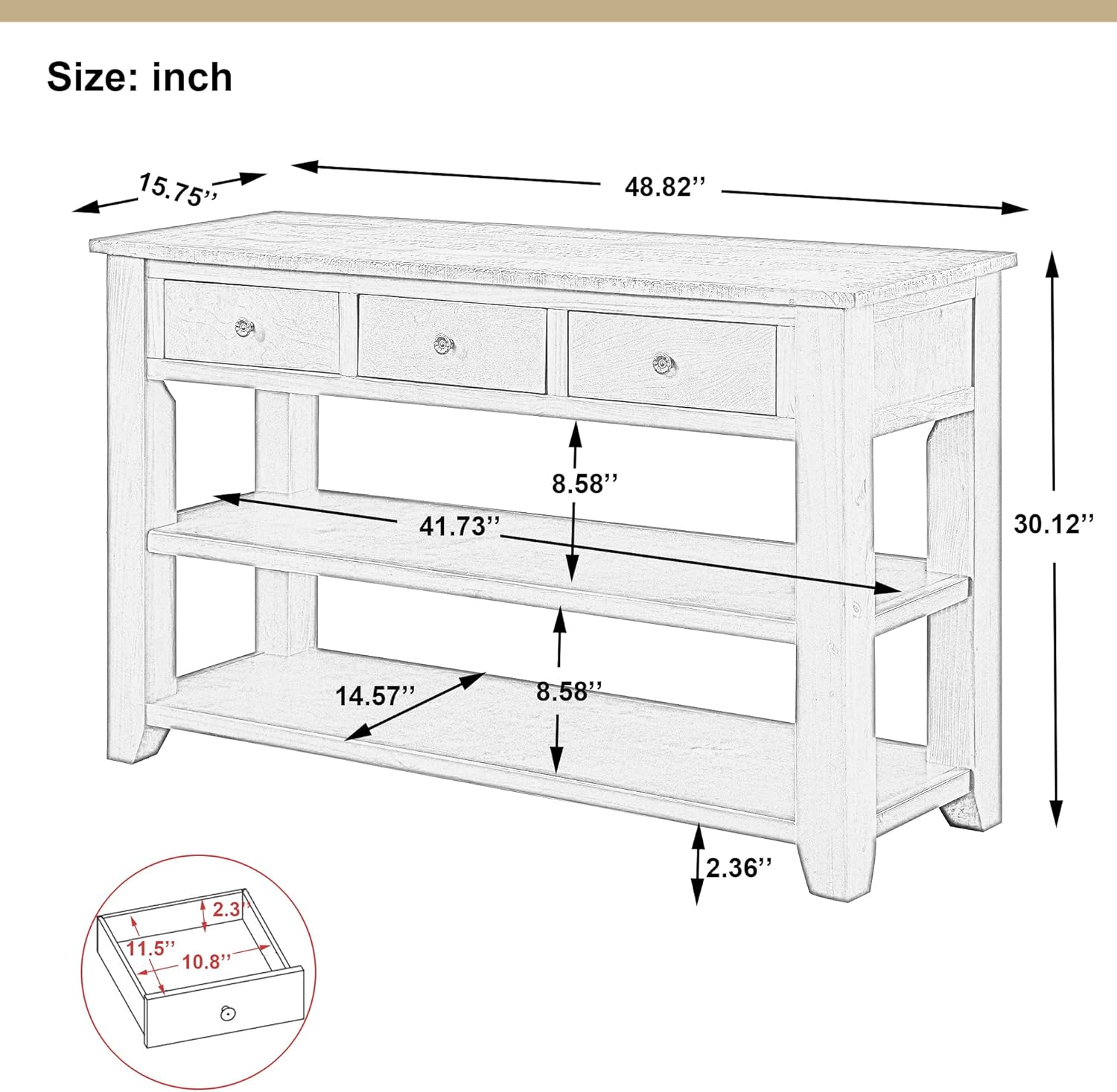 - Includes two open shelves to display storage of plants, photos, baskets and other decorative accents, while having 3 drawers providing concealed space for small loose items, such as keys, mails and more.