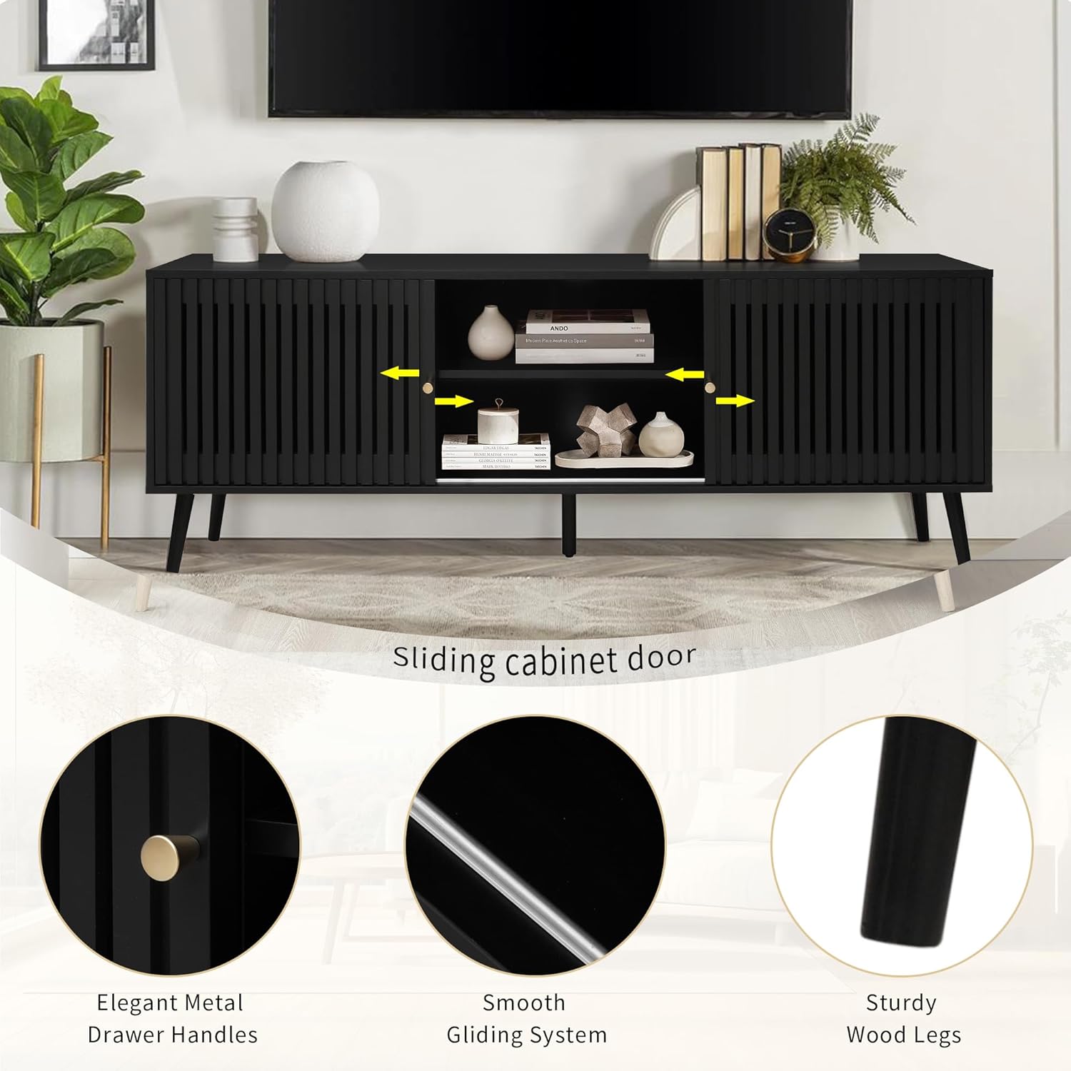 Mid Century Modern TV Stand for Televisions up to 70 Inches, with Sliding Doors and Storage, Television Stands, TV Consoles, Media Consoles for Living Room, 63 Inch (Black)