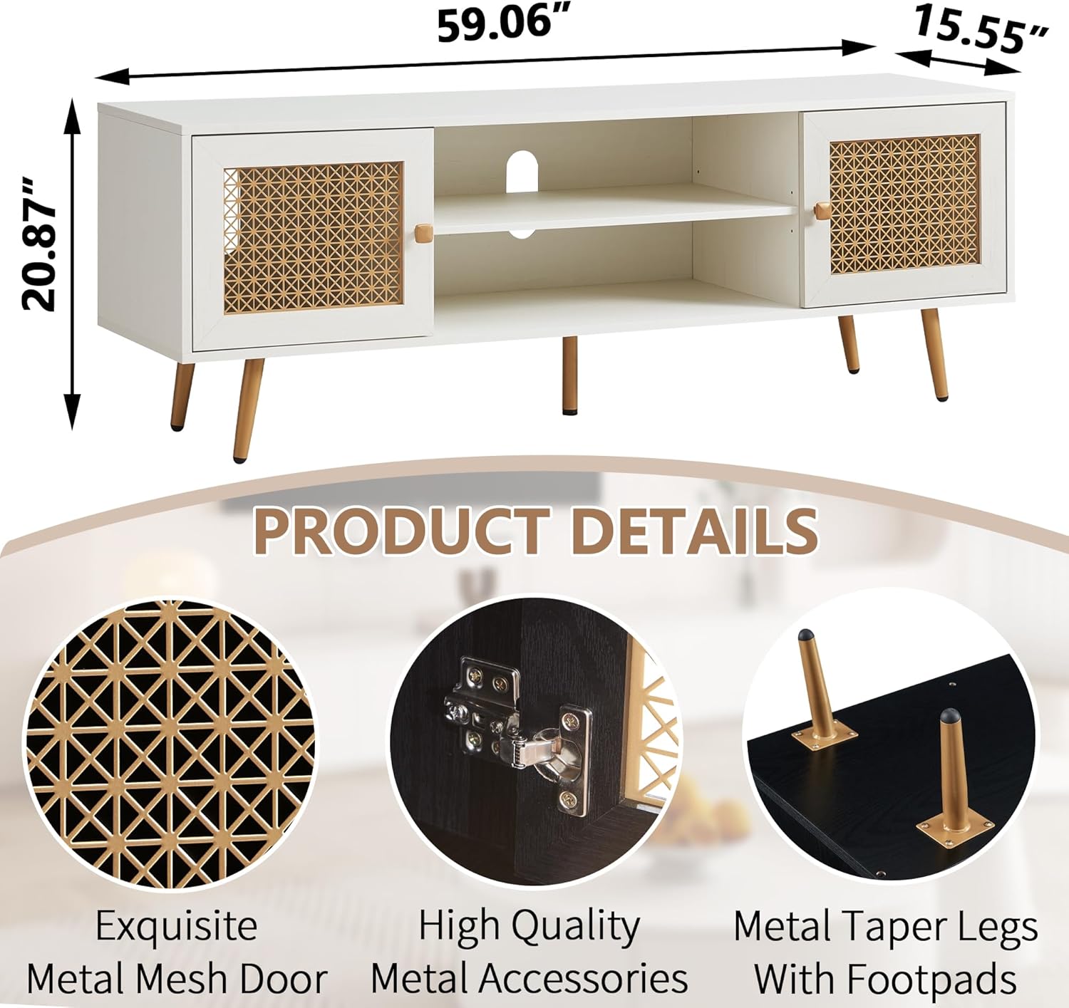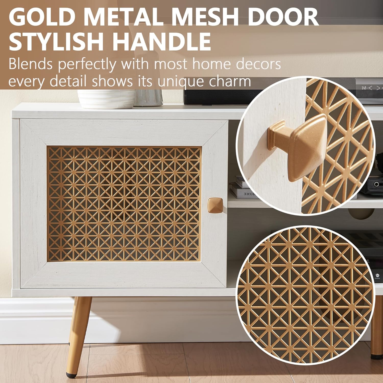 - Mid Century Design: This TV cabinet features a mid-century aesthetic with an retro wooden exterior and gold metal mesh doors decorated.Available in three colors: Rustic Oak, Black and Antique White,you can exactly choose the one as you like.Every detail was fit in well with most home decors with it unique charm