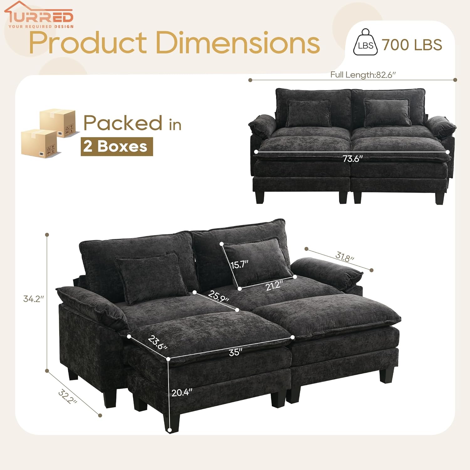URRED Modular Sectional Sofa Comfy Cloud Couch, Modern Chenille Sofa Sleeper Deep Seat Couches with Ottoman/Pillows for Living Room (Black, 82.6''- 2 Ottomans)