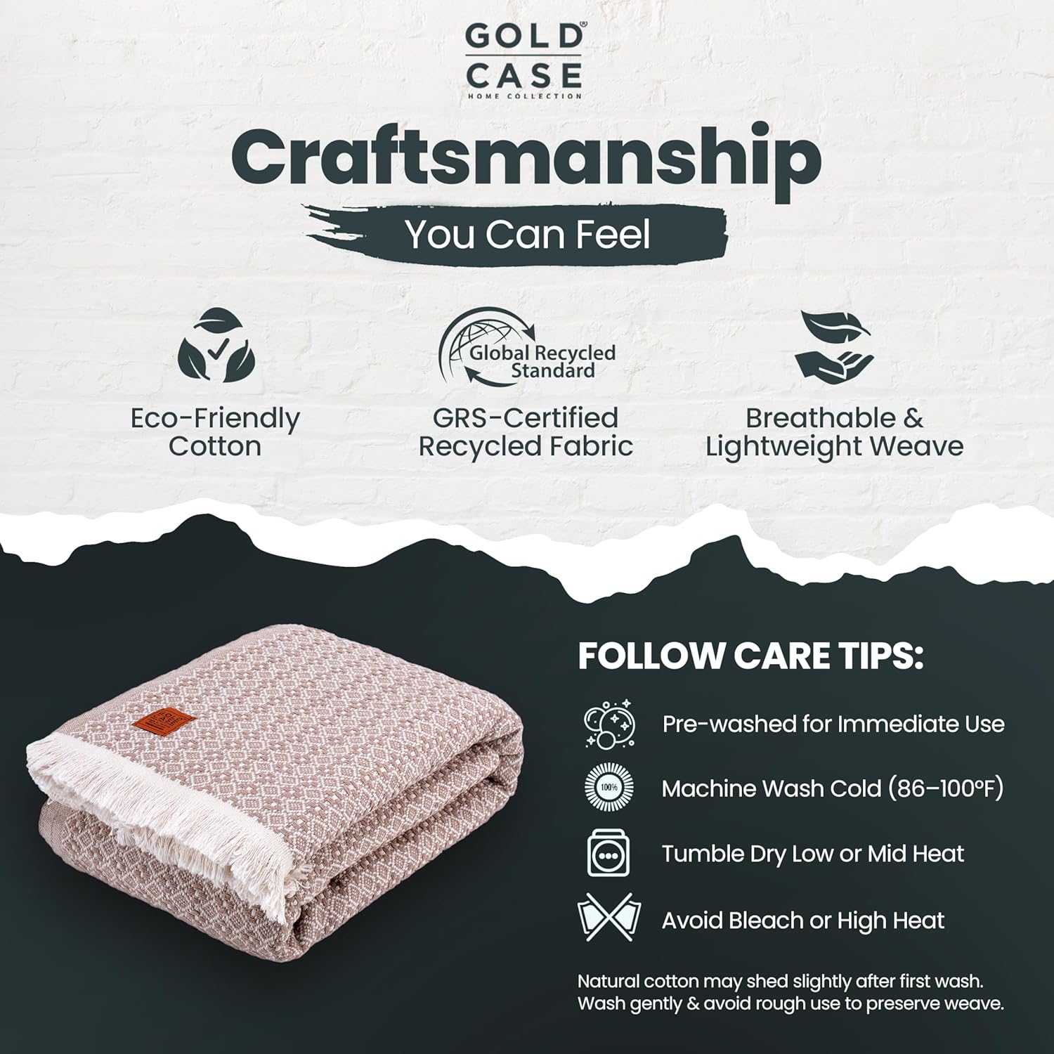 Gold Case Throw Blanket for Bed – 100% Recycled Turkish Cotton Bed Blanket – Decorative Throw Cotton Blankets for Living Room & Bedroom – Retro Beige Woven Queen Blankets – 90x90