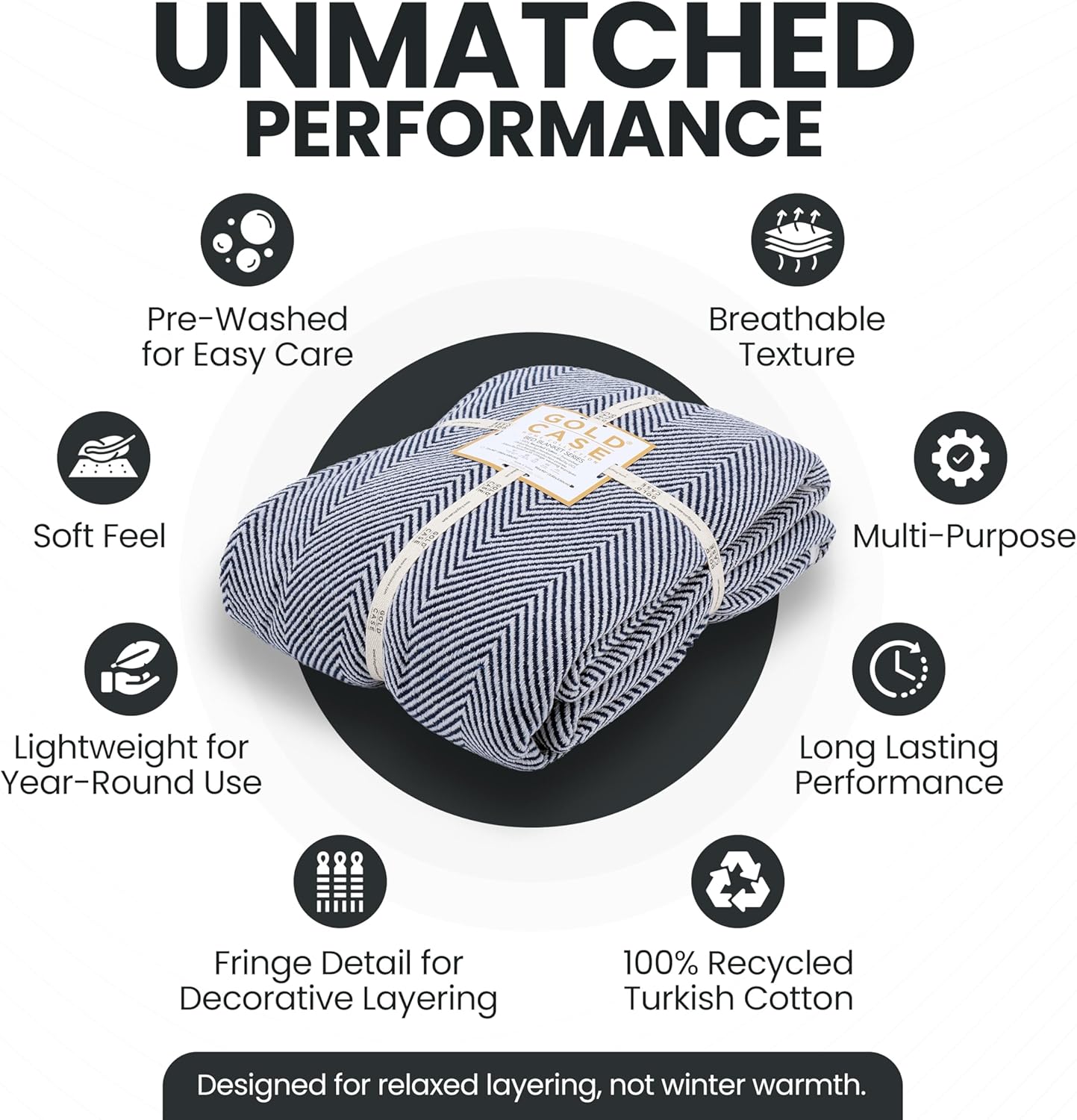 Gold Case Throw Blanket for Bed – 100% Recycled Turkish Cotton Bed Blanket – Decorative Throw Cotton Blankets for Living Room & Bedroom – Woven Twin Blankets - 71x90 - Navy Blue
