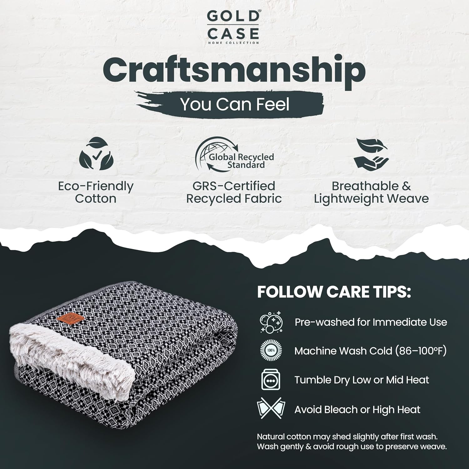 Gold Case Throw Blanket for Bed – 100% Recycled Turkish Cotton Bed Blanket – Decorative Throw Cotton Blankets for Living Room & Bedroom – Woven Twin Blankets - 71x90 - Black