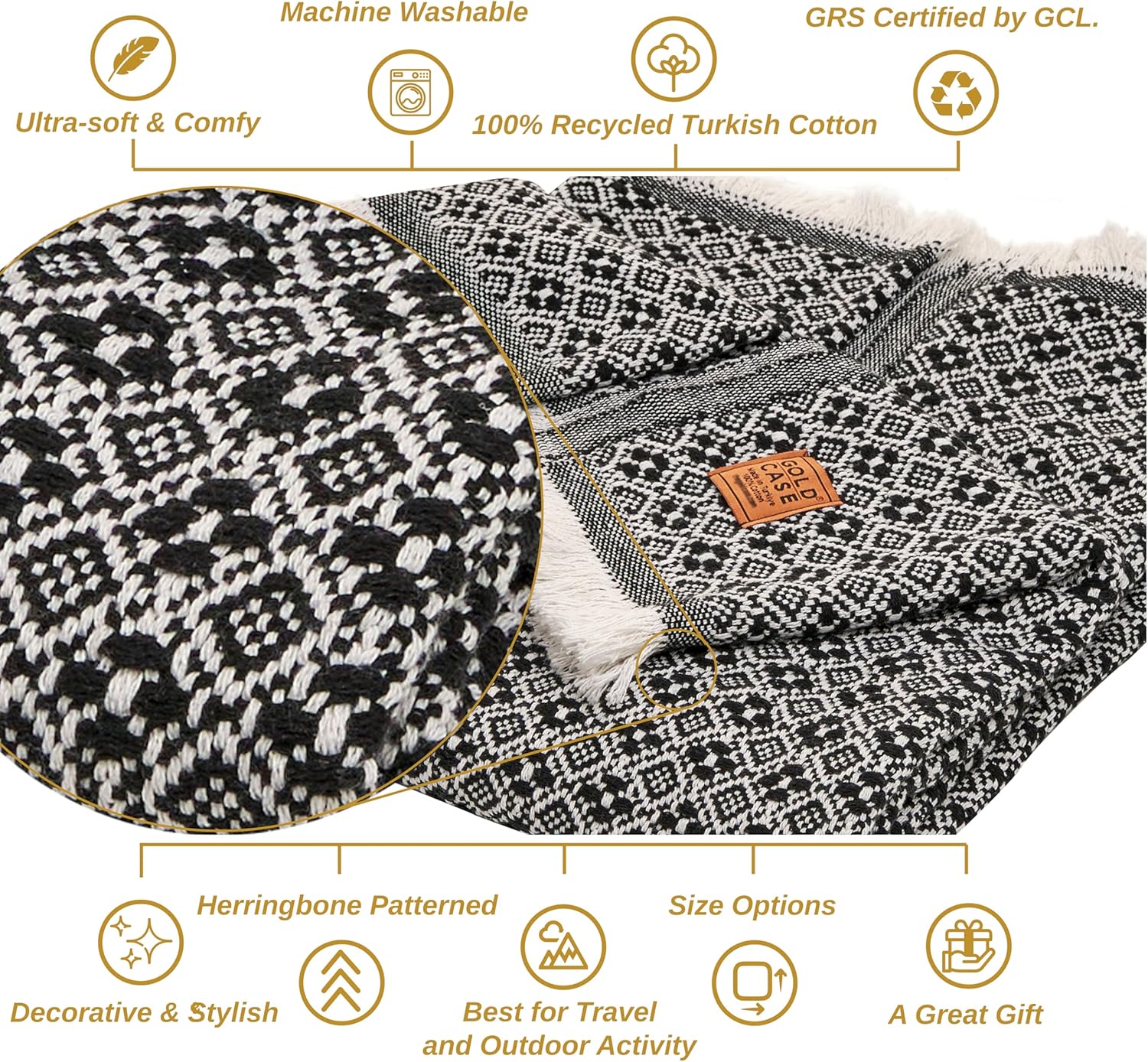 Gold Case Throw Blanket for Couch - 100% Recycled Turkish Cotton Blankets & Throws - Retro Soft Throw Blankets for Living Room Sofa - Boho Decorative Woven Throws for Couch - 60x80 - Black