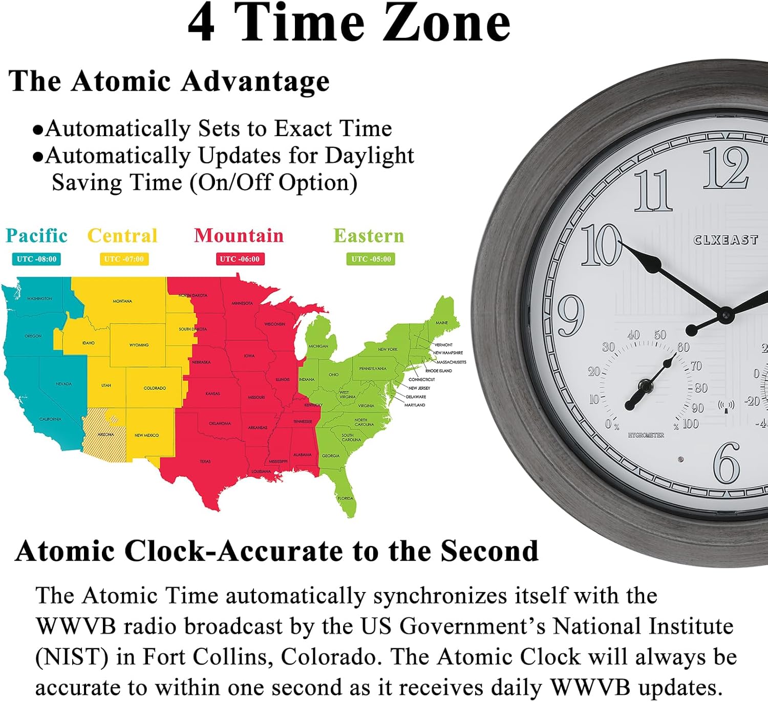 - [Atomic Time-Accurate to the Second] - The Atomic Time Feature conveniently allows the clock to sync with the WWVB radio transmission from Fort Collins, CO, for accurate time updates, and no more worry about Daylight Saving Time any more,our outdoor atomic clocks sets themselves! Automatically set itself and readjust to Daylight Saving Time by WWVB(On/Off option);4 USA TIME ZONE selections: Pacific Standard Time(PST)-"P"; Mountain Standard Time(MST )-"M"; Central Standard Time(CST)-"C"; Eastern Time(EST)-"E" area