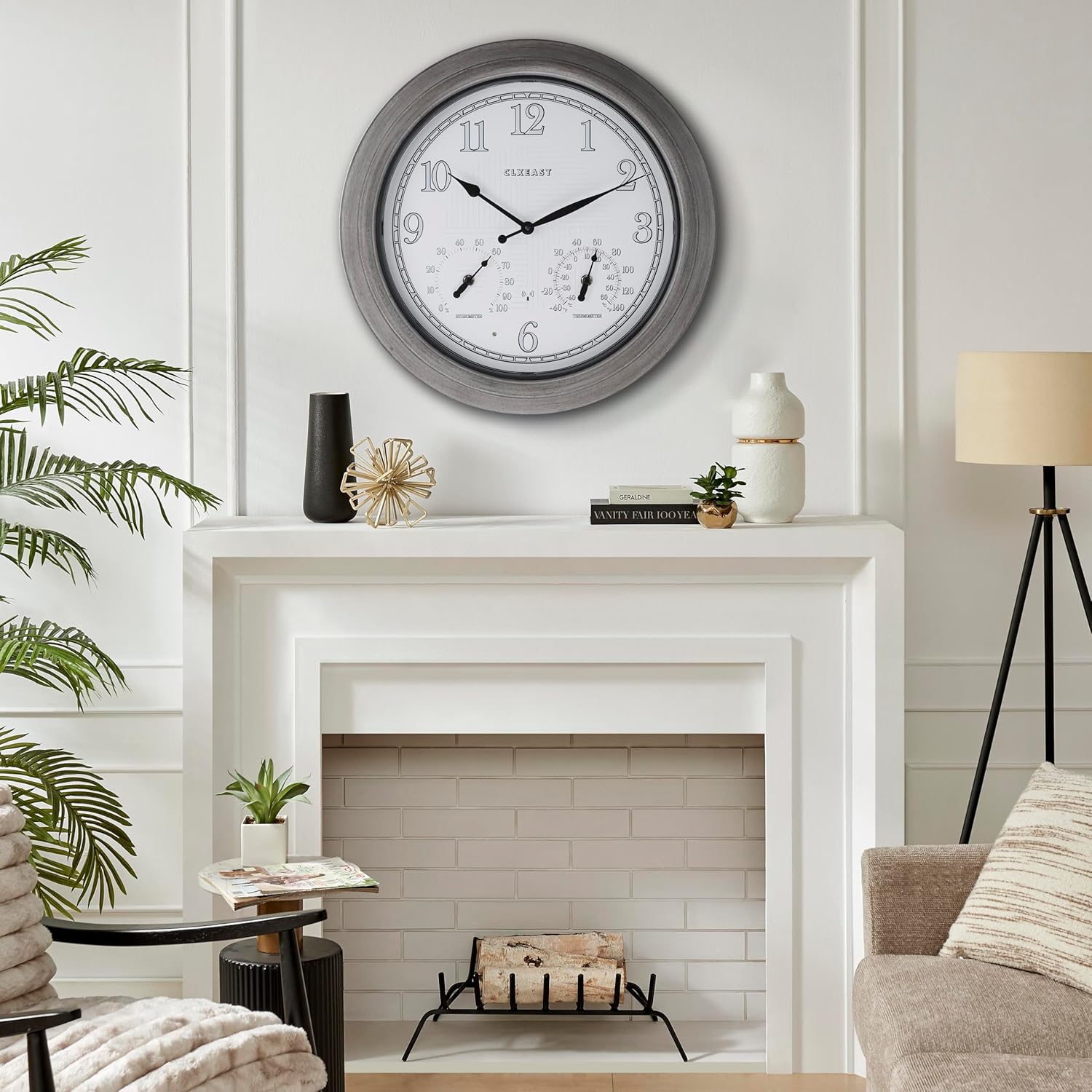 - ăIP65 Waterproof Outdoor/Indoor Atomic Wall Clock]-This hand brushed grey oak/faux barnwood 18 Inch large outdoor clock is UV resistant& weatherproof,sealed with front and back rubberized gasket for protection from water and other outdoor elements.An elegant timepiece for your outdoor garden,pool, patio or backyard,porch,modern farmhouse living room,dinning room,bathroom,kitchen,fireplace,entryway,home office; Make sure the clock is away from exposed direct elements like heat,sunlight and constant rain for lasting performance