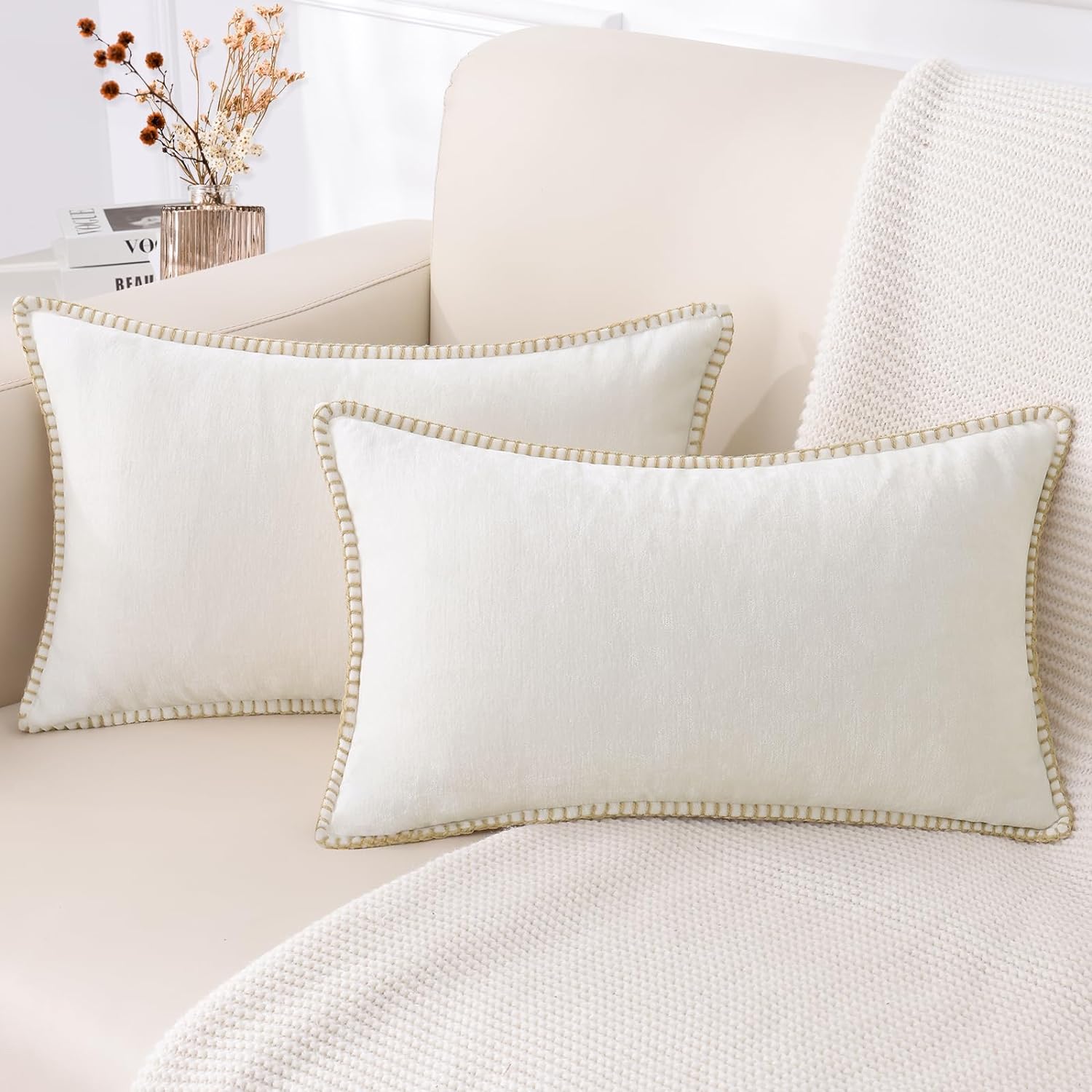 decorUhome Chenille Soft Throw Pillow Covers 12x20 Set of 2, Lumbar Velvet Farmhouse Neutral Decorative Euro Pillow Covers with Stitched Edge for Couch Sofa Bed Home Decor, Cream White