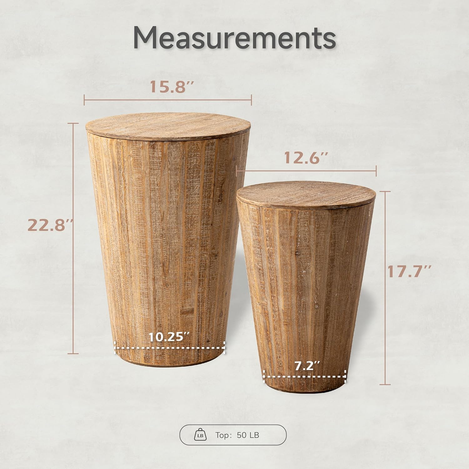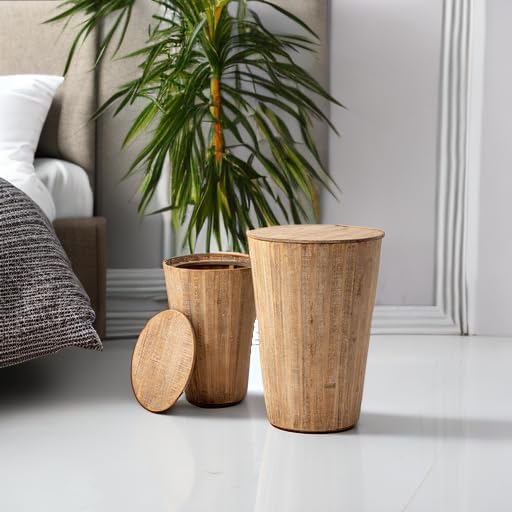 - UNIQUE DESIGN: Vertical pieces of wood wrap around the perimeter while the round tabletop has a smooth surface for an accent lamp or a stack of coasters; The distressed finish showcases the natural beauty of the wood grains, making it a perfect pick for industrial lofts, boho, french country or modern farmhouses alike; The tall barrel has removable lid for storage while the short barrel has sealed tray top