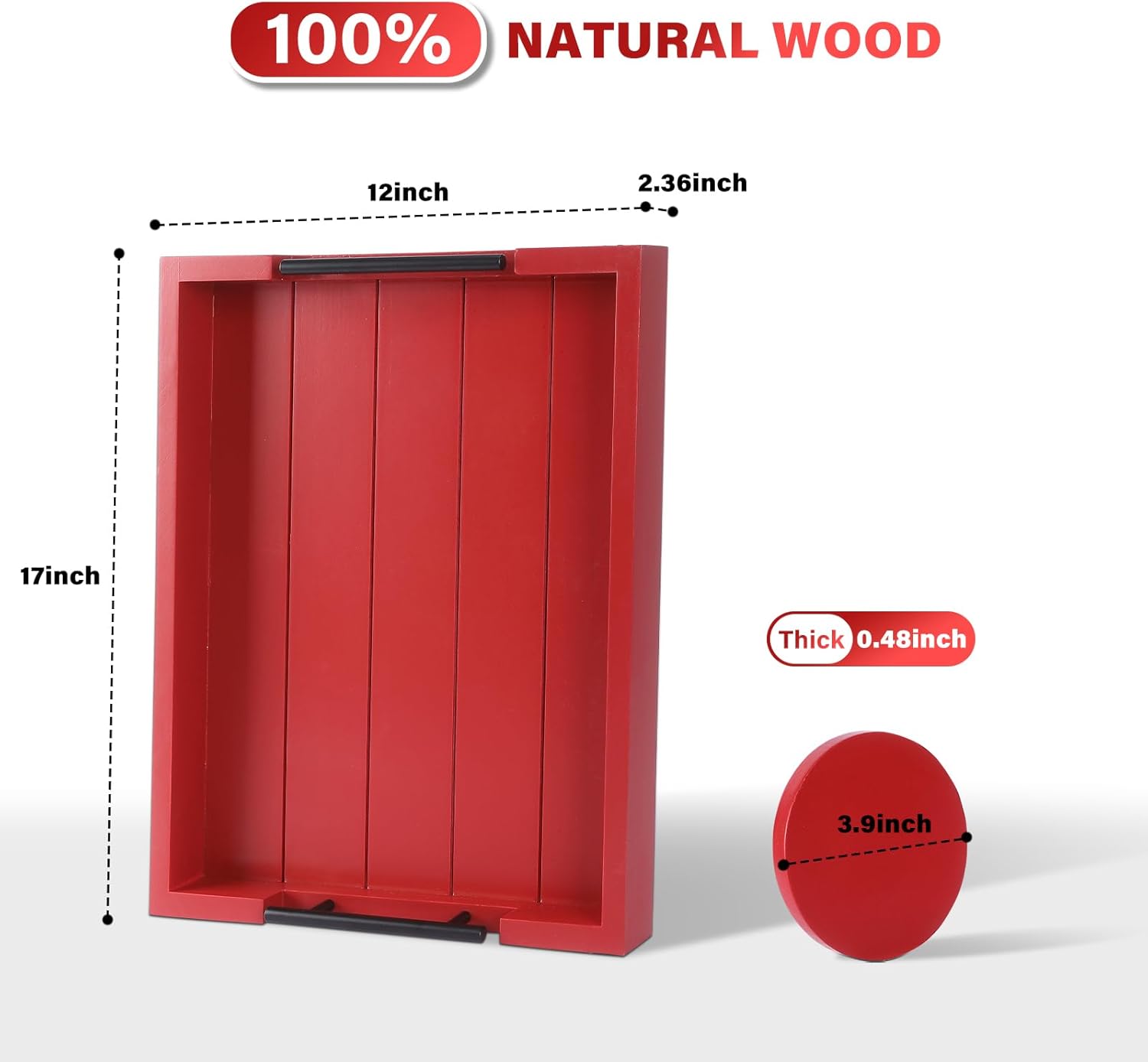- BEAUTIFUL HANDCRAFTED DESIGN – Carefully crafted from premium quality fir wood with fine attention to details, our wooden serving tray set or tray for ottoman coffee table has ergonomically fitted metal handles for ease of carrying. Measuring 17”x 13”, this wood serving tray (rectangle) is the ideal size to carry snacks, drinks, and meals around the house without any hassle - WONDERFUL home decor!