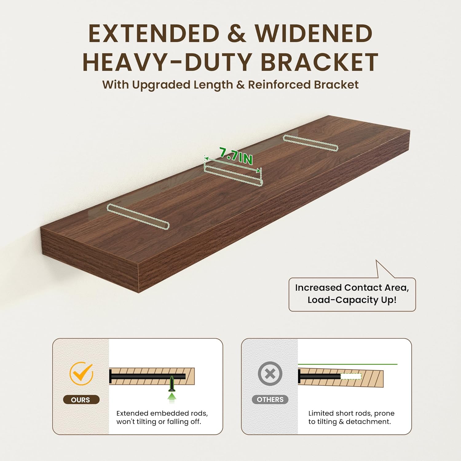 Deep Floating Shelves for Wall - 55 Inch Wide x 12 Inch Deep Wall Shelves Set of 1 - Rustic Walnut Color Wood Shelves for Living Room, Bathroom, Laundry Room, Bedroom, Kitchen, Home Office