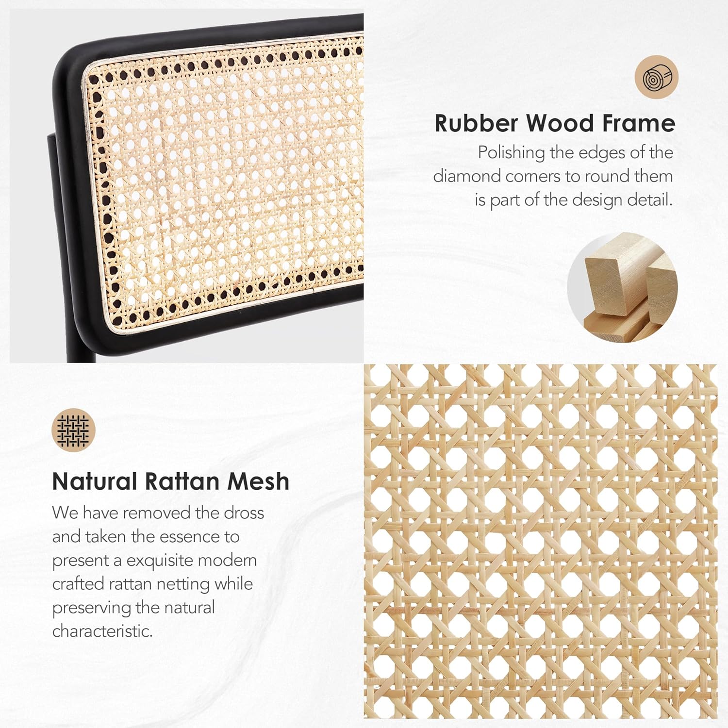 - Comfortable seating experience: We have thickened the cushion to 2.7 inches to improve comfort, and the cushion measures 19.3 inches long by 17.3 inches wide. In addition, the natural rattan backrest is perfectly positioned to provide lumbar support for a comfortable dining experience