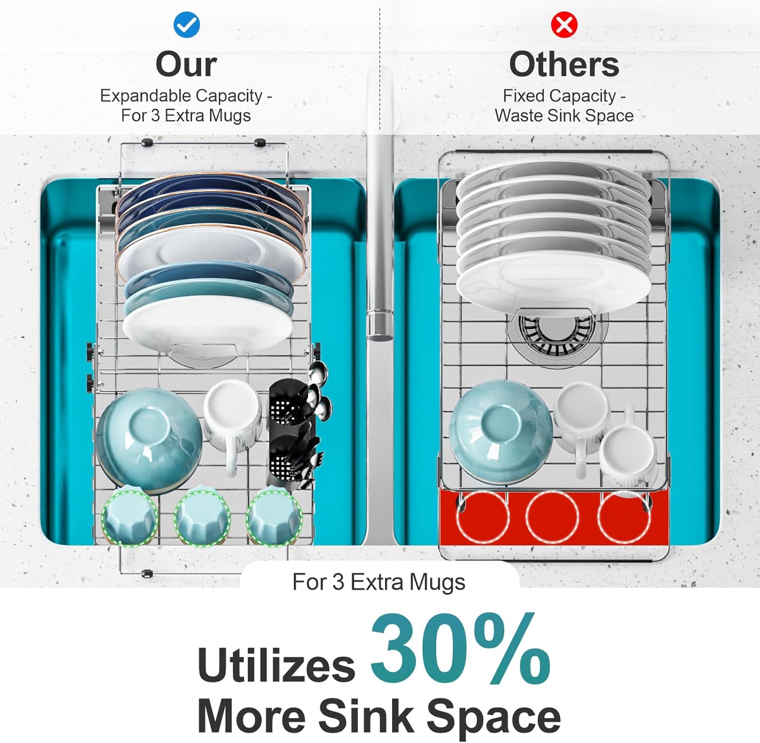 - True Expandable, Real Capacity Boost: Unlike other racks that only extend handles, our dish drainer expands as a whole unitâtruly increasing your drying space, allowing you to comfortably hold at least 3 extra cups in addition to 6 plates, bowls, utensils, and even fresh fruits and veggies. This innovative design not only ensures perfect sink compatibility but genuinely maximizes your drying area