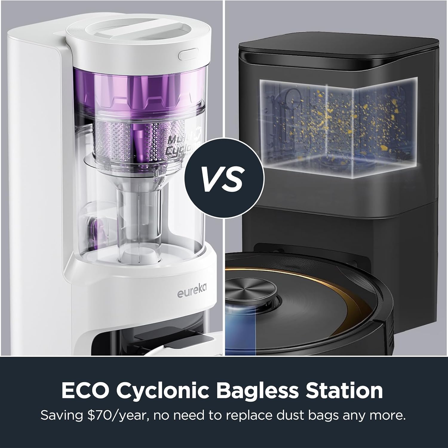 - ăBagless Self-emptying StationăSay farewell to messy, wasteful cleaning with eureka E10s bagless self-emptying station. This system keep dust at bay for up to 45 days. What's more, its bagless design means you won't have to splurge on more dust bags, saving you up to $70 a year.