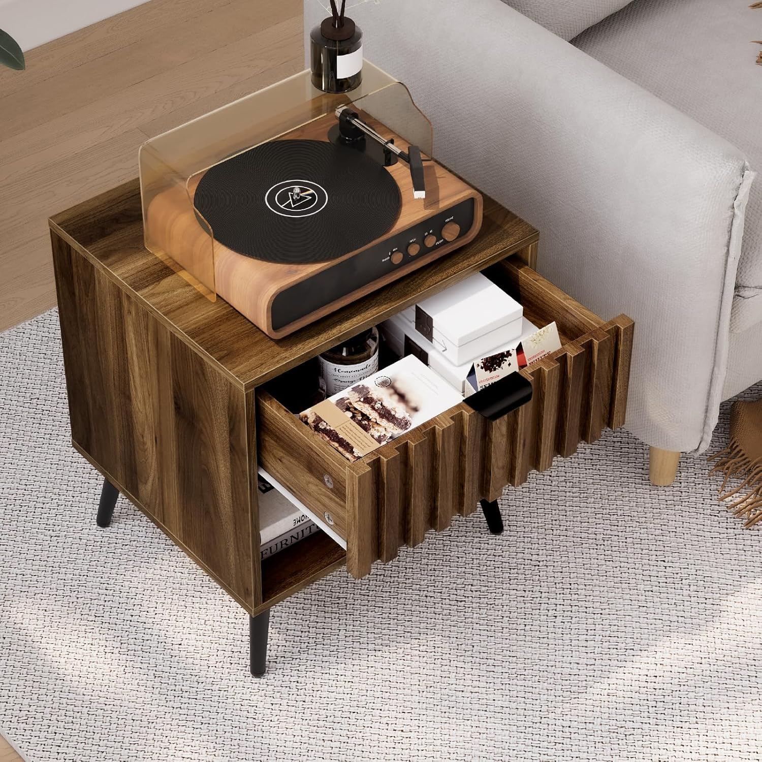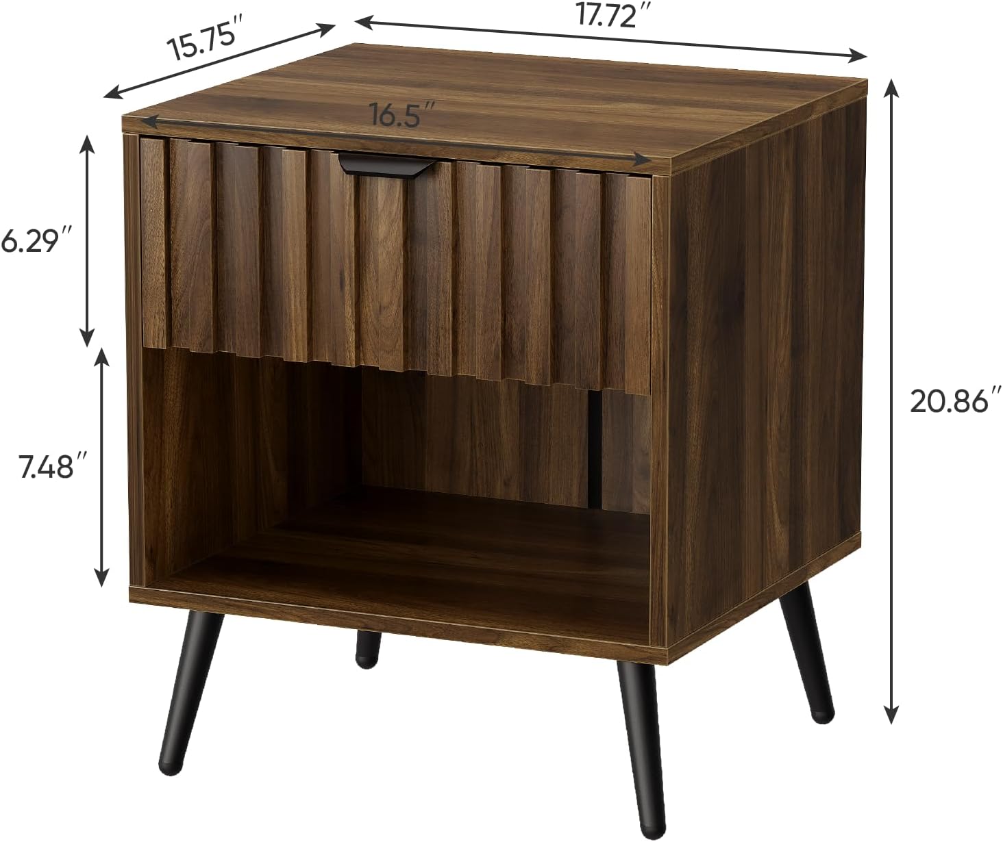 Smuxee Walnut Wooden Night Stand, Mid Century Nightstand with Fluted Drawer, Bedside Table with Open Shelf, Modern End Side Table for Bedroom
