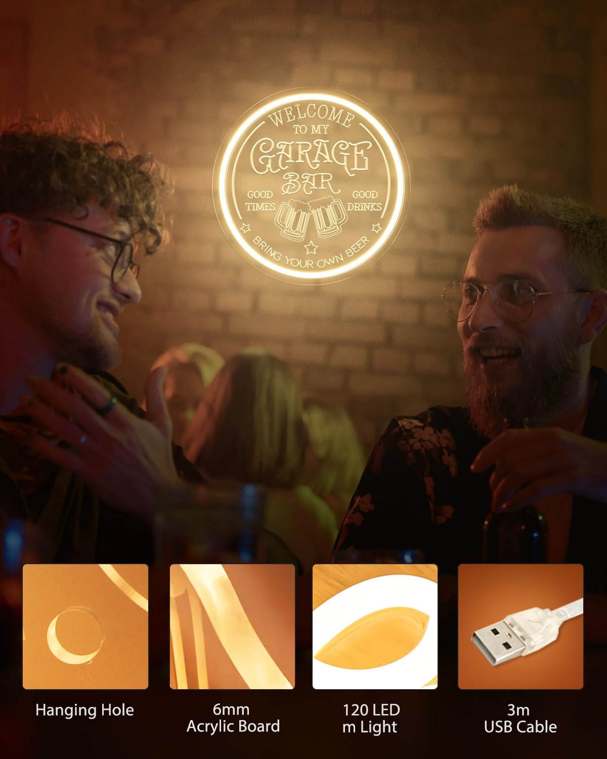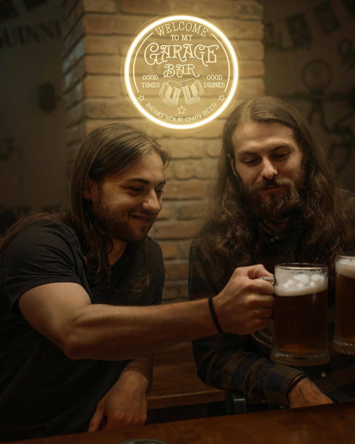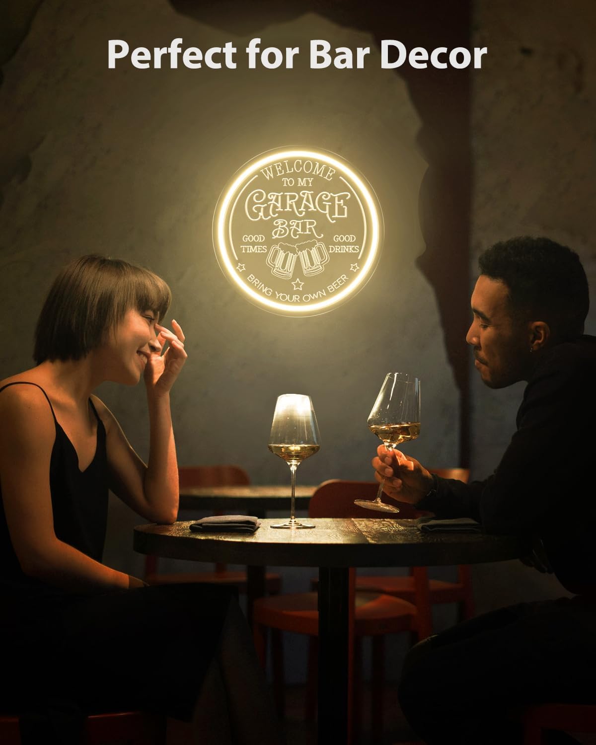 - đžăPerfect Wall DecorăUse this bar neon sign in your garage bar to create a unique atmosphere and make a wonderful addition. It's a really nice mood light and it definitely adds flavor to an otherwise plain space. This led sign can also be used to decorate many scenes, such as garage, back yard, patio, poolside, bedroom, home pub, game room, man cave, BBQ party and so on.
