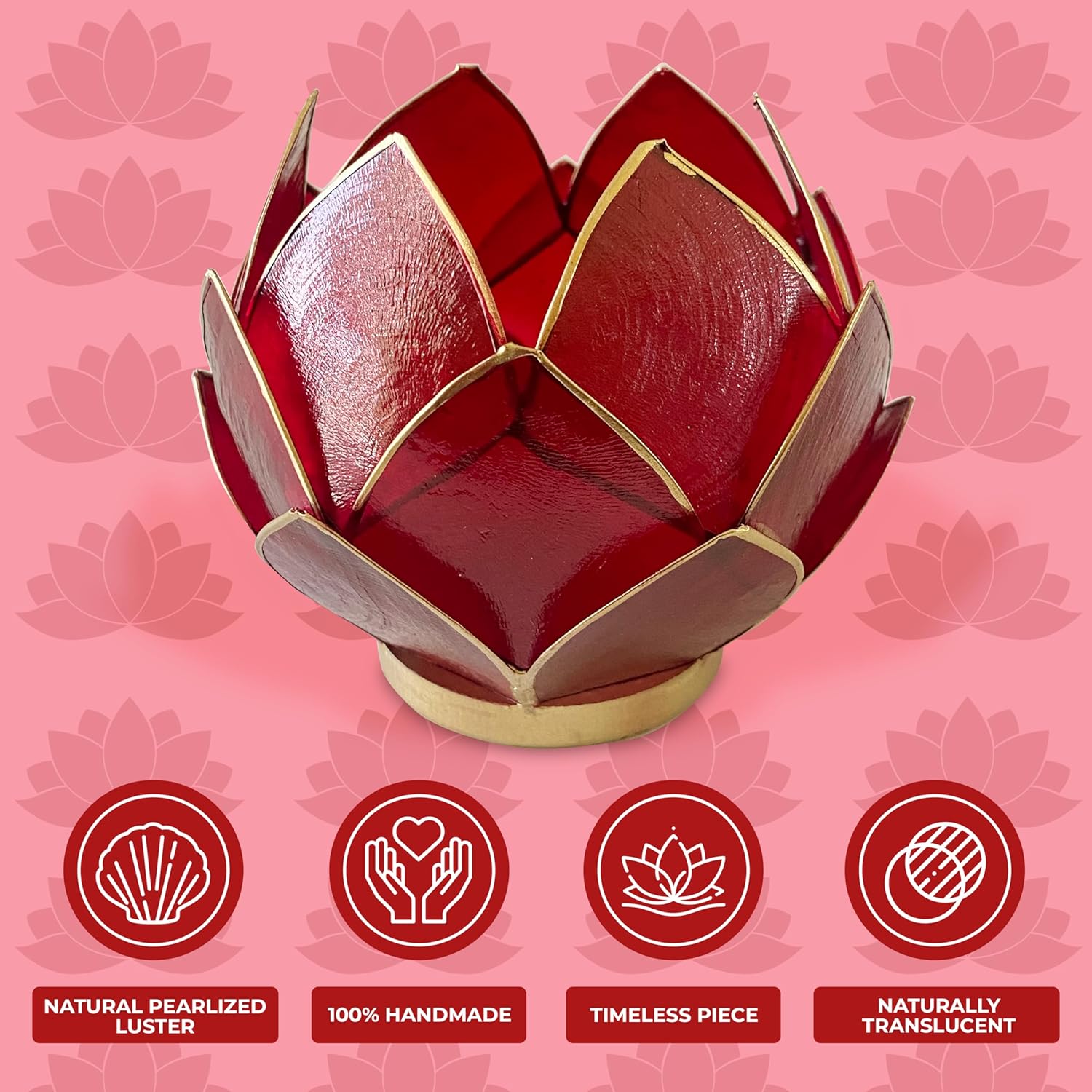 Blooming Lotus Capiz Shell Tealight Candle Holder, Handcrafted Decorative Tea Light Candleholder with Translucent Flower Petals for Ambient Illumination and Natural Elegance, Red